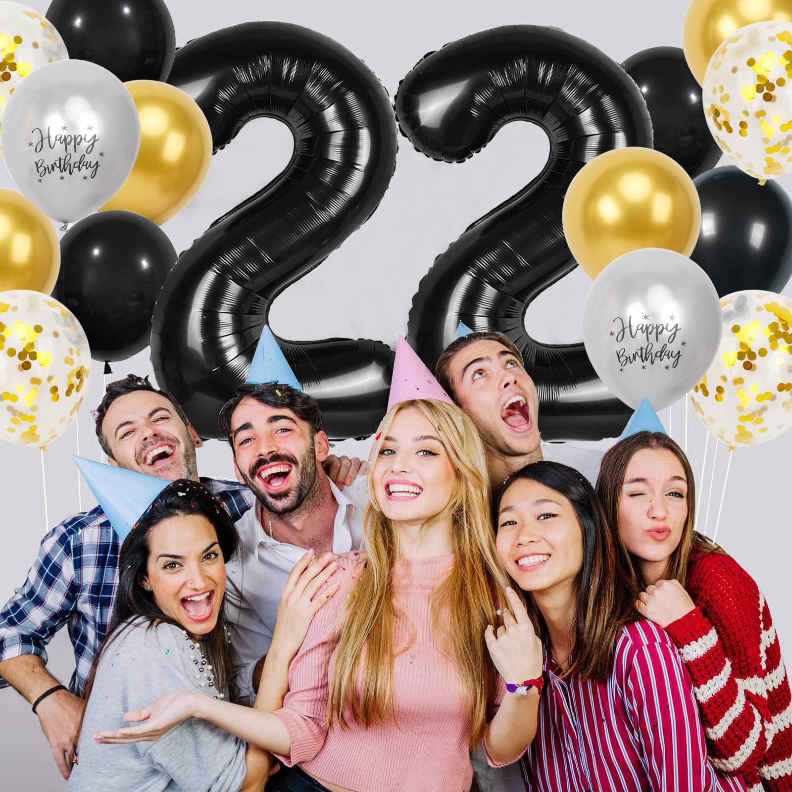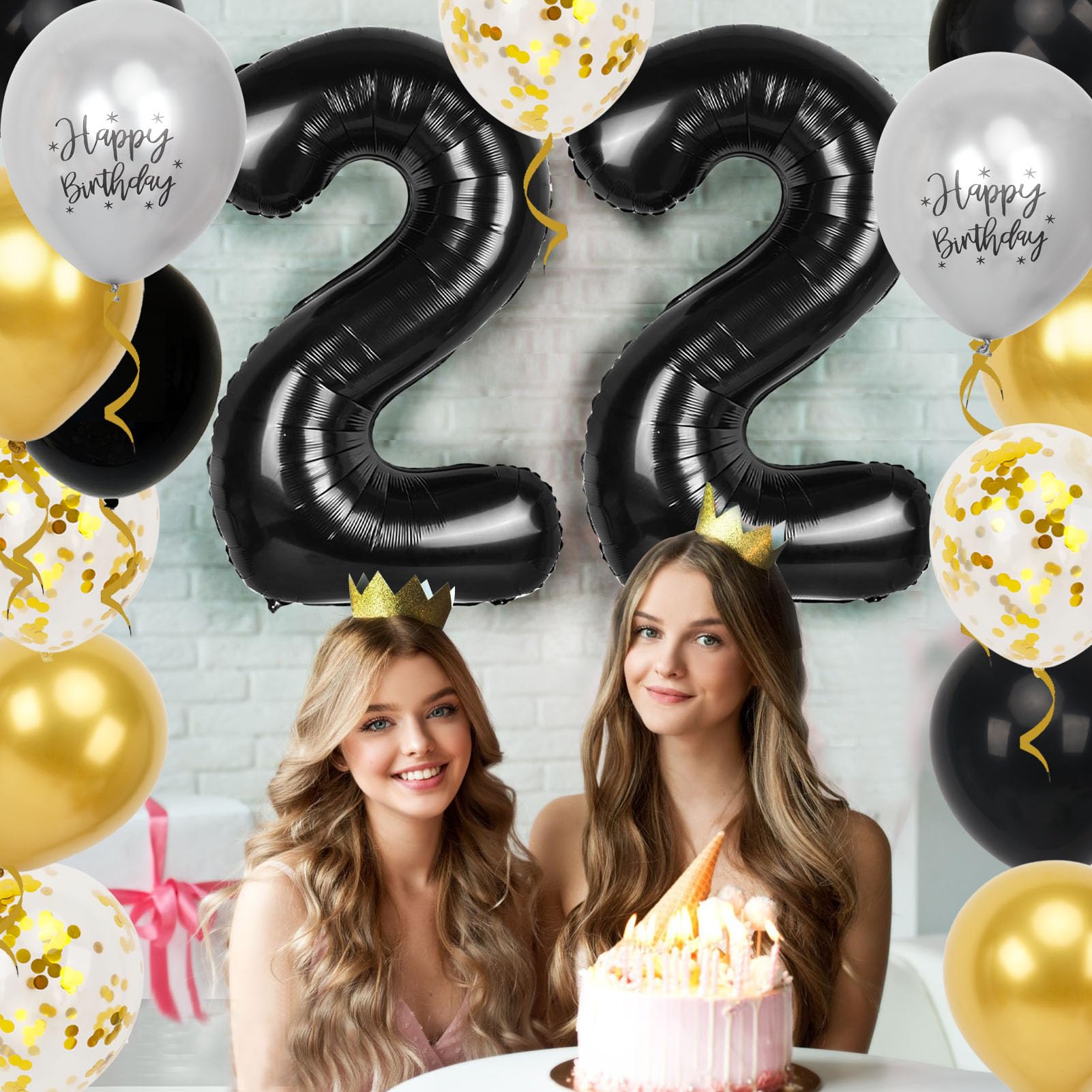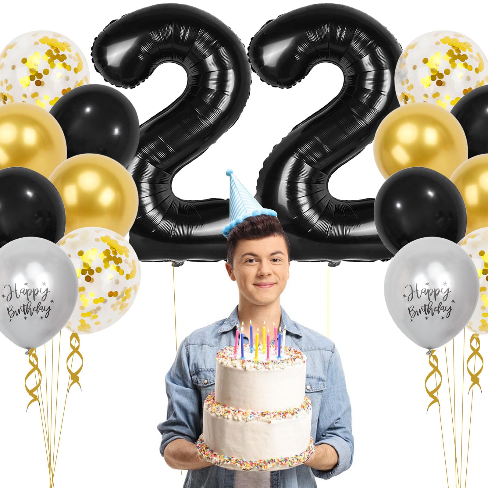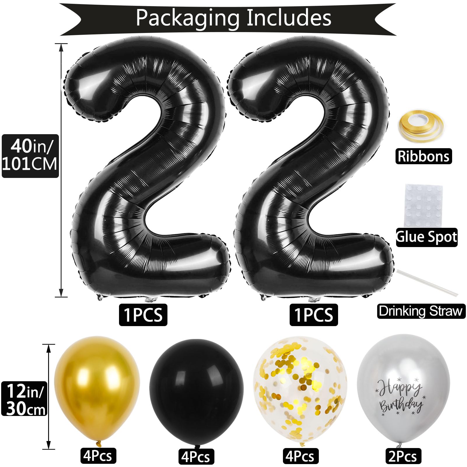 22 Birthday Decorations for Men Set: Package includes 2 pcs large 40 inch black 22 balloon numbers, 4 pcs 12-inch gold metallic balloons, 4 pcs 12-inch gold confetti balloons, 4 pcs 12-inch black latex balloons, 2 pcs 12-inch silver metallic birthday balloons, 1 gold ribbon, 1 piece of straw 1 sheet of glue dots. This 22nd birthday decorations is perfect for celebrating your 22nd birthday or 22nd anniversary decorations and makes your party even more exciting!