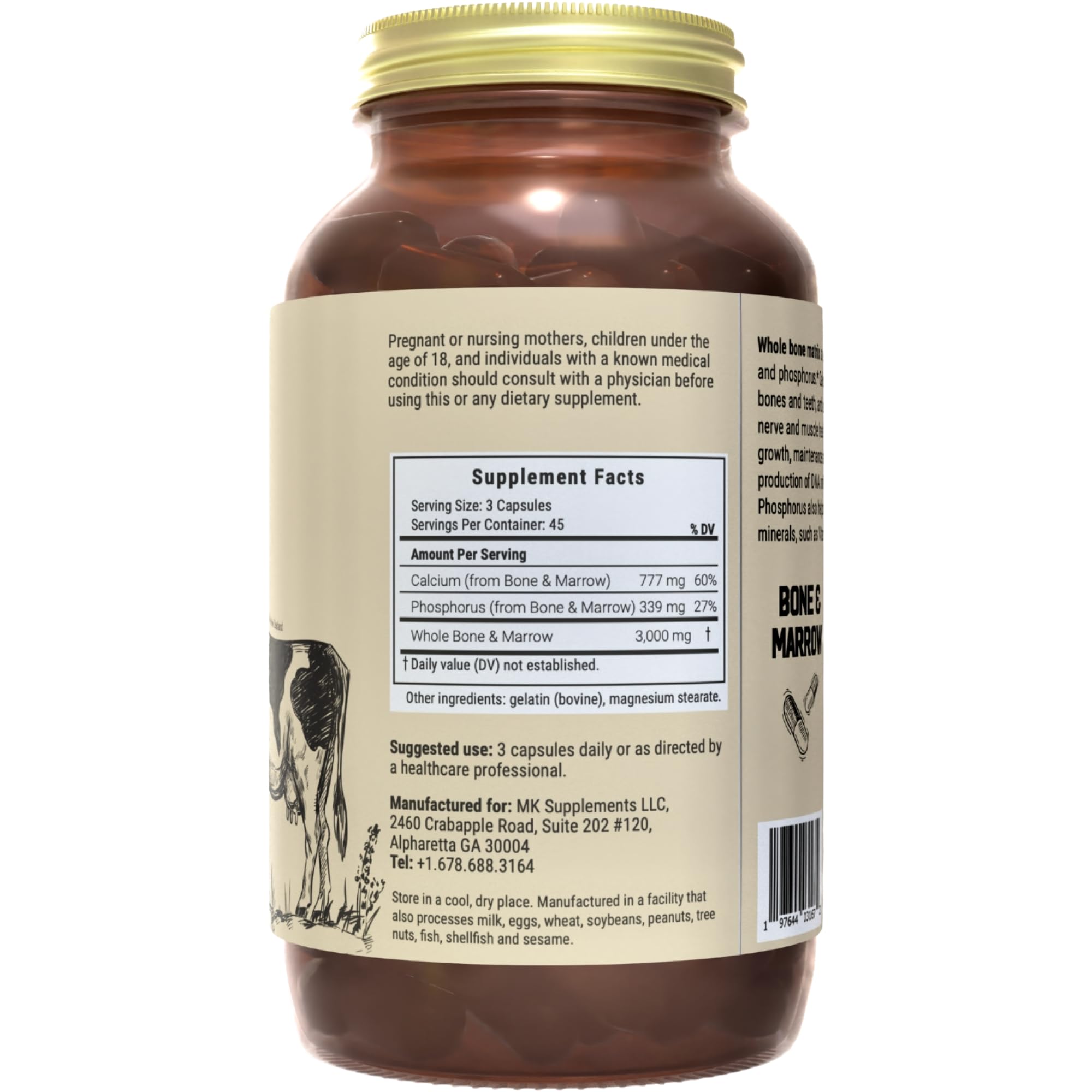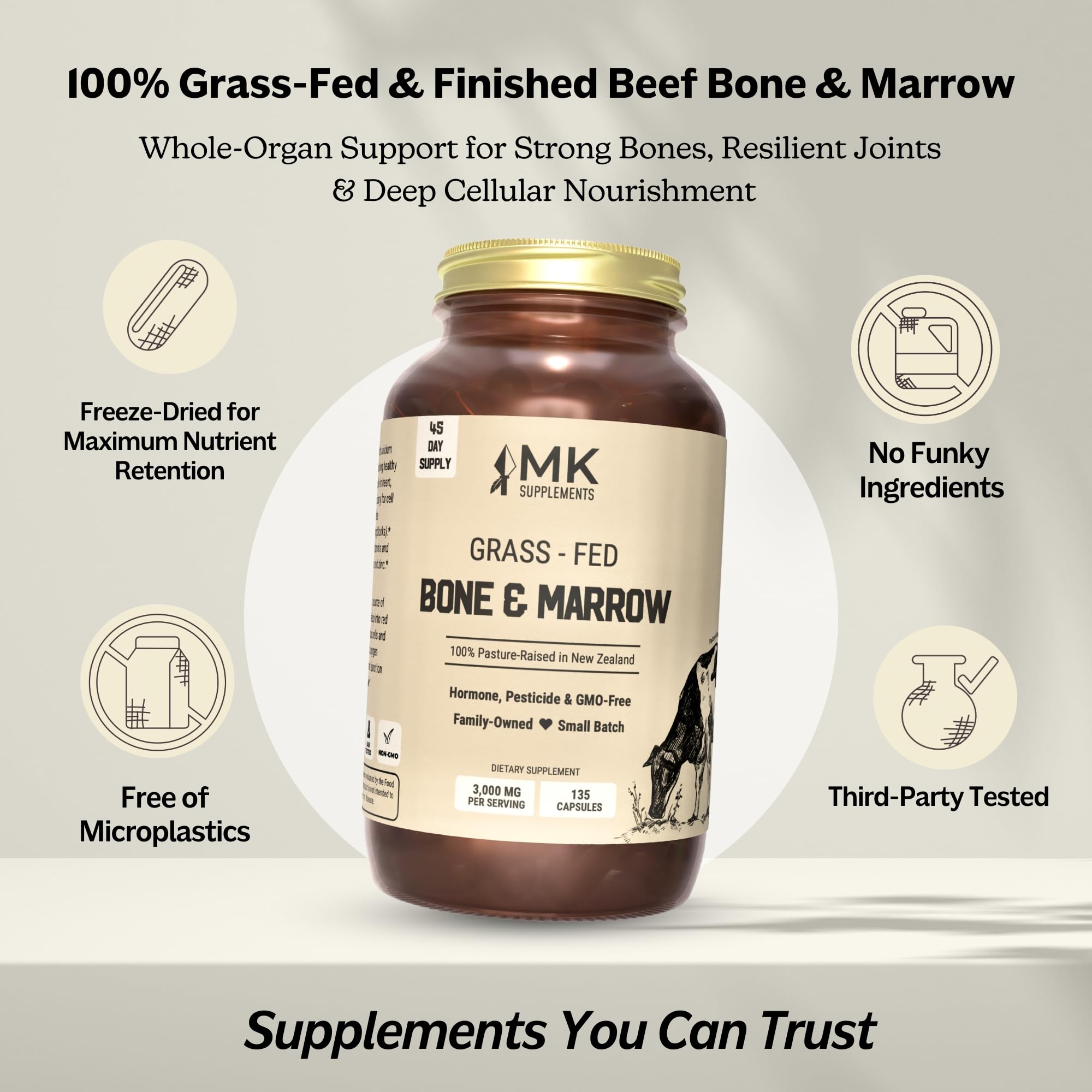 1 bottle = 45-day supply: Our beef Bone & Marrow complex comes in bottles of 180 gel capsules, good for 45 days. Manufactured in the USA, our desiccated Bone & Marrow capsules are shipped in glass bottles with metal lids to avoid contamination with microplastics.