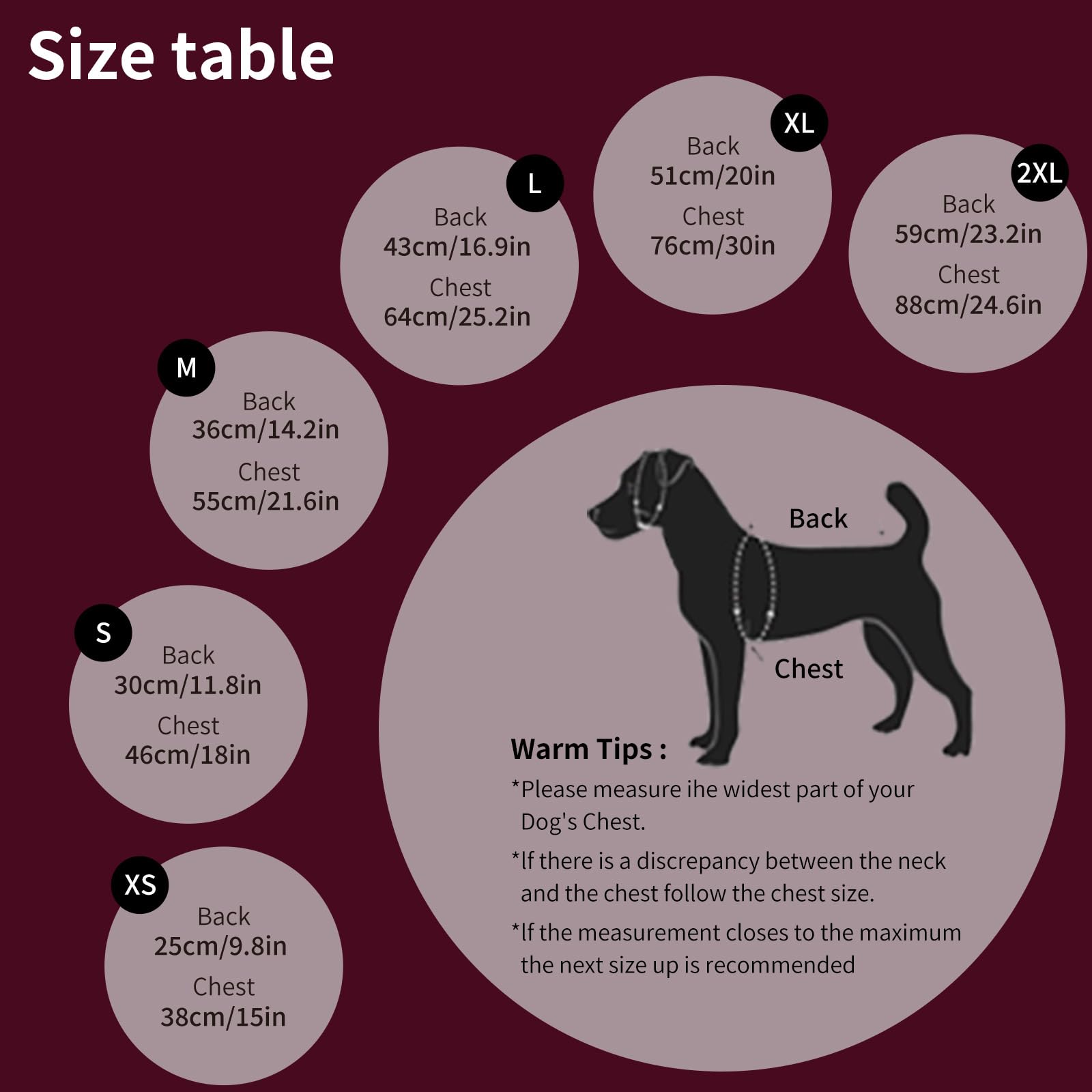 【FIT FOR SMALL AND MEDIUM DOGS】 Please use soft tape to measure your dog and select the size based on the Chest Girth (the widest part of ribcage) and Back Length (base of the neck to base of tail)and the weight of your dog . If Between Sizes, please Select One Size Up.