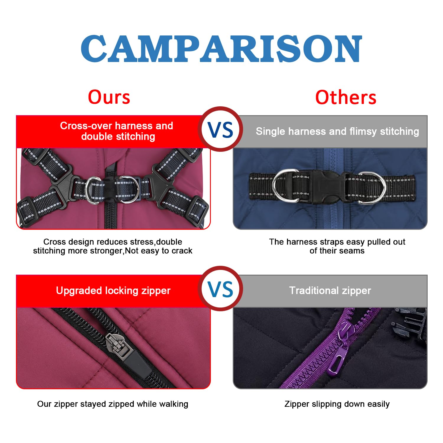 【BUILT IN CROSS-OVER HARNESS】Winter dog coat and dog harness 2 in 1 design,no need extra dog vest harness.Cross design reduces stress,strengthened seams and sturdy D-ring can withstand strong pulling force from your puppy, make everyday walks more enjoyable!All you need is putting on small dog coat, a quick clip and go!In addition, safety reflective strips on the harness,provide extra visibility during night,making your dog easily noticeable to motorists and pedestrians.