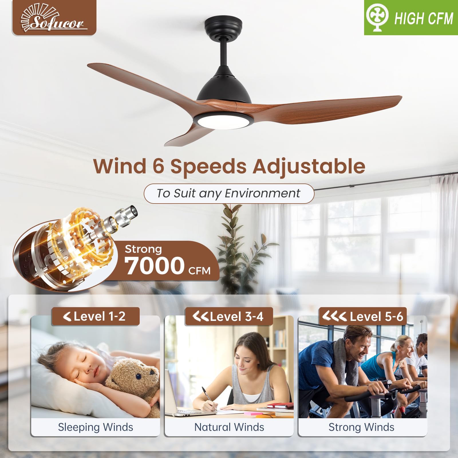 7000CFM Strong Airflow & Adjustable Speed: Sofucor living room ceiling fan has a maximum airflow of 7000 CFM — surpassing 80% of other ceiling fans. With 6 adjustable speeds ranging from soft to strong airflow to meet both indoor and outdoor needs.