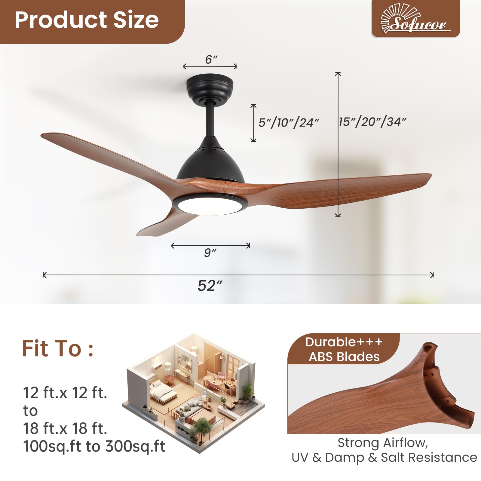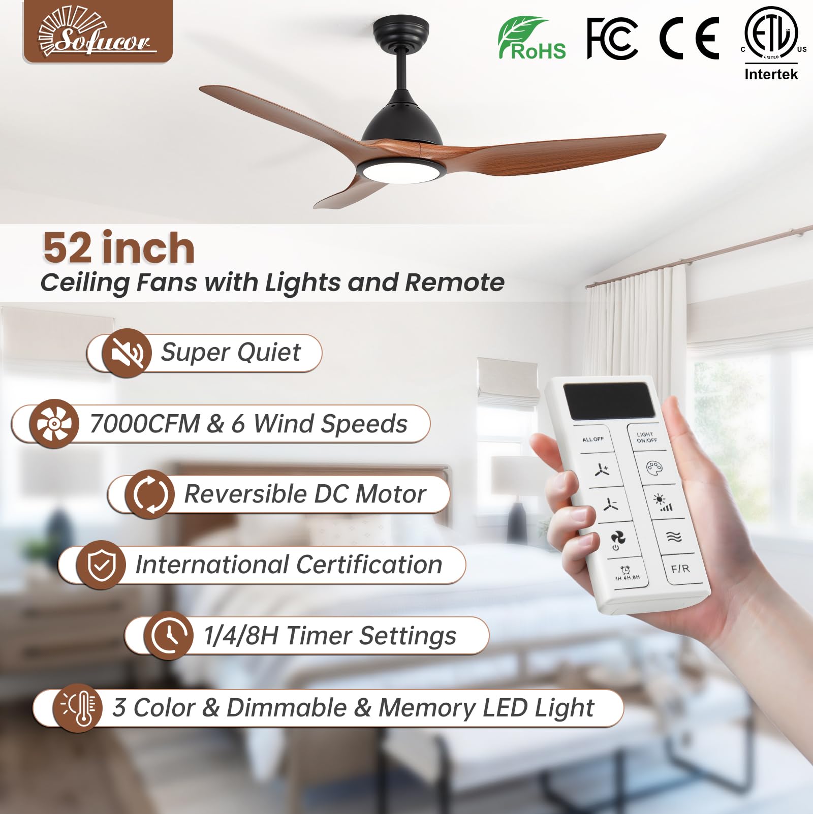 Lifetime Motor Maintenance: Sofucor ceiling fan has passed ETL and FCC certifications. Our technical team will assist you within 24h. We offer a 3-year protection plan for accessories and lifetime motor maintenance. Choose Sofucor for quality and reliability!