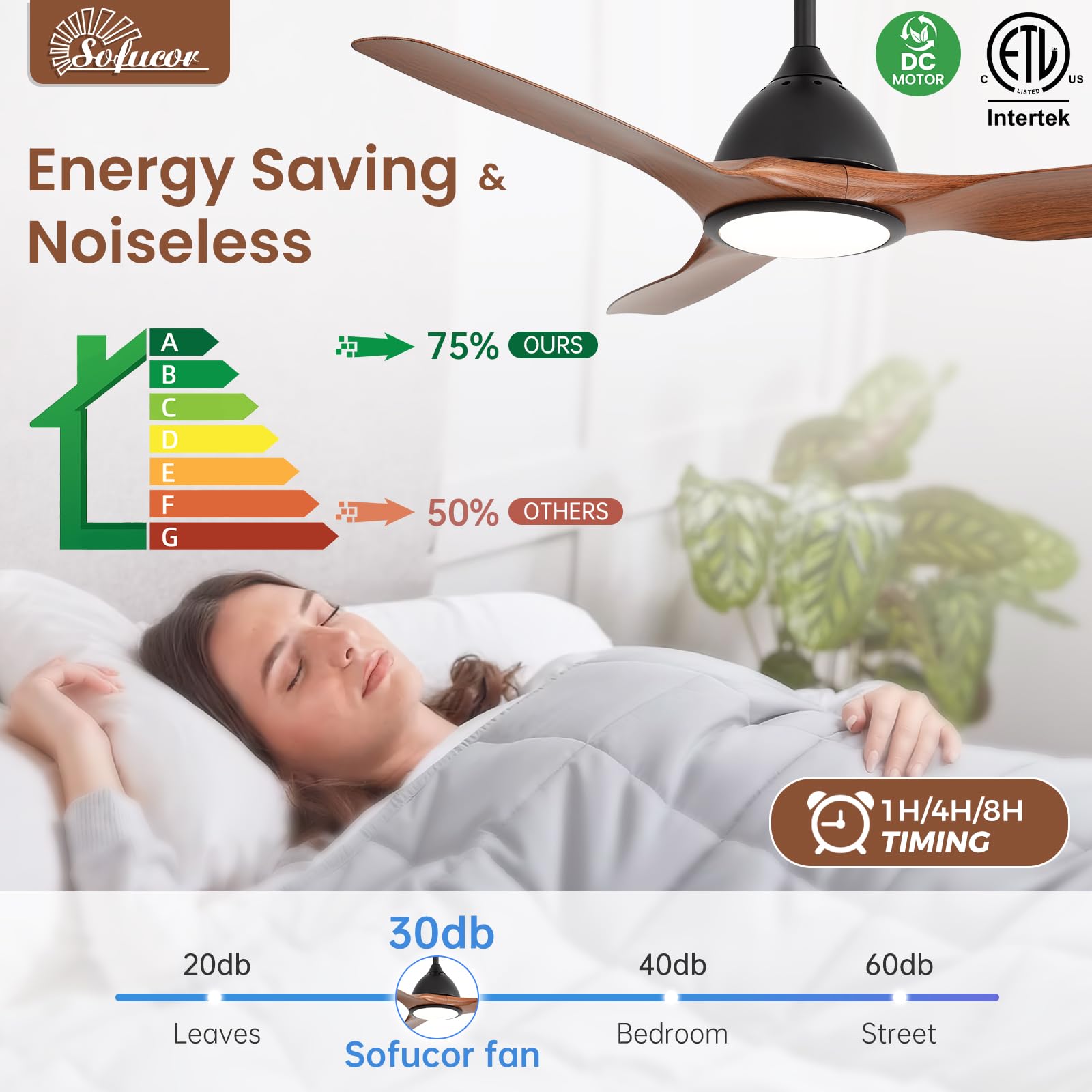 Quiet & Reversible DC Motor: Sofucor Bedroom ceiling fan features a cutting-edge DC motor that runs quietly (<30dB) and saves 65% energy than AC motors. Our 52 inch propeller ceiling fan with light features reverse airflow for both summer and winter use!