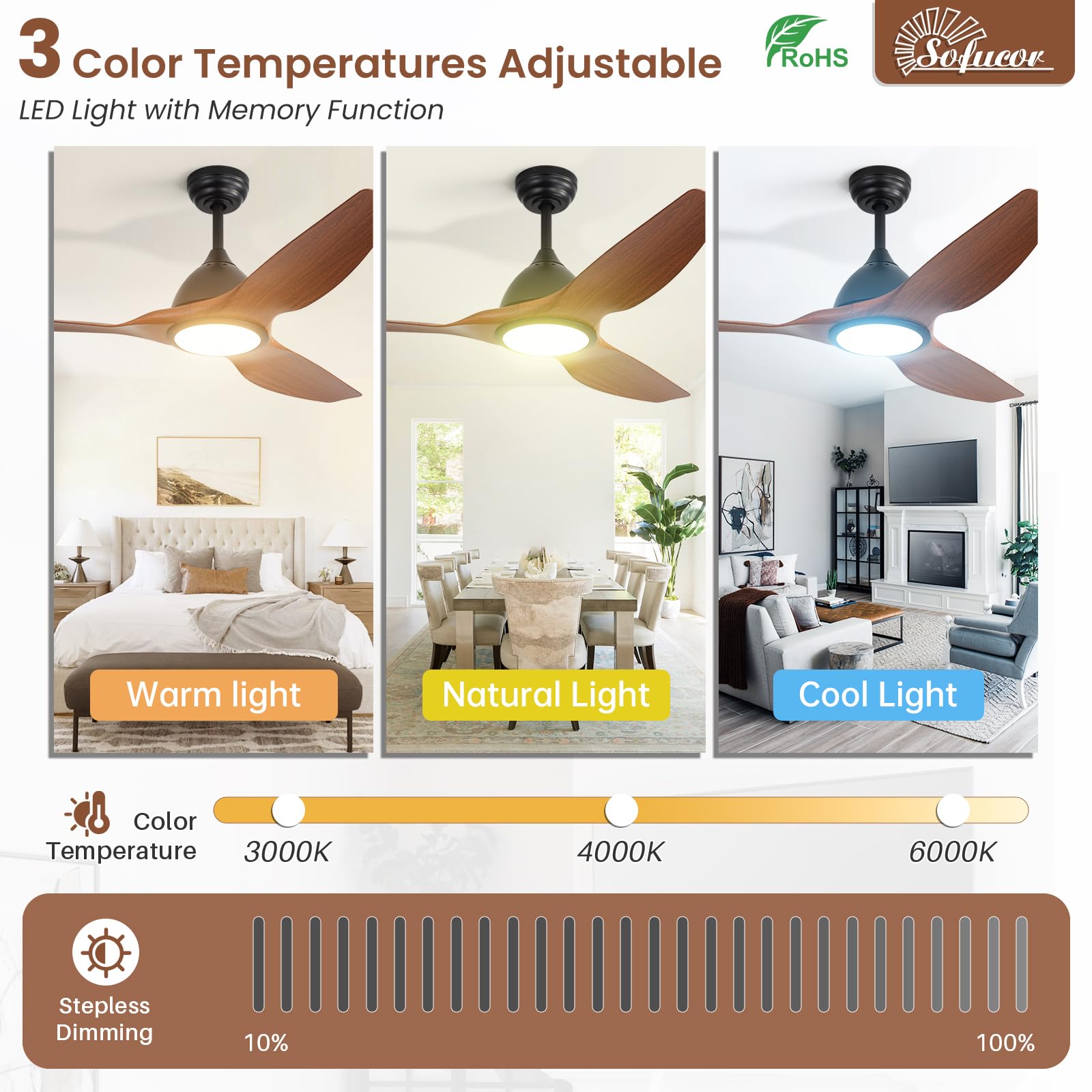 3 Light Colors & Memory Function: Sofucor LED ceiling fan features a 18W LED light with 3 color temperatures: 3000/4000/5700K and 10%-100% 2100 Lumen brightness adjustment to relieve your eye fatigue. Perfect for study-room bedrooms and living rooms!