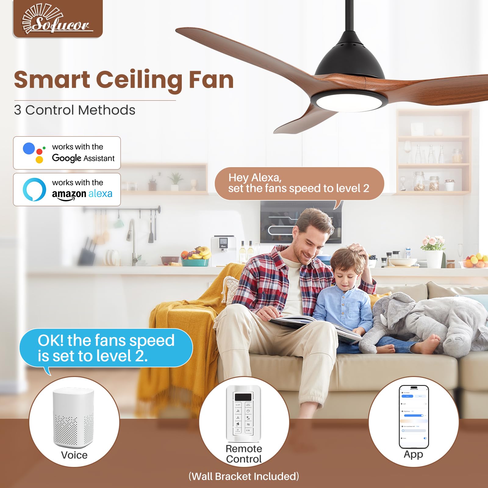 Ceiling Fan with Timer: Enjoy independent control over both fan speed and lighting. Sofucor 3 ABS blades ceiling fan with light comes with a wall bracket that can be used as a wall switch. Set the timer to 1/4/8 hours to save power. Especially at night, set the timer so you don't have to get up in the middle of the night to turn off the fan for your family.
