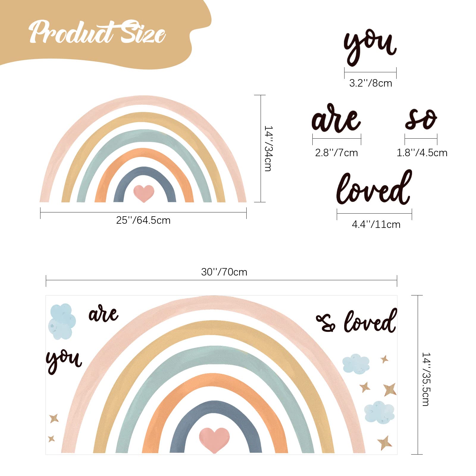 Large rainbow wall decal: toddler wall decals are approximately 30 x 14 inches/ 76 x 35 cm; There is a tip for you, to prevent curling after sticking, put kid room wallpaper under the weight and flatten them before using