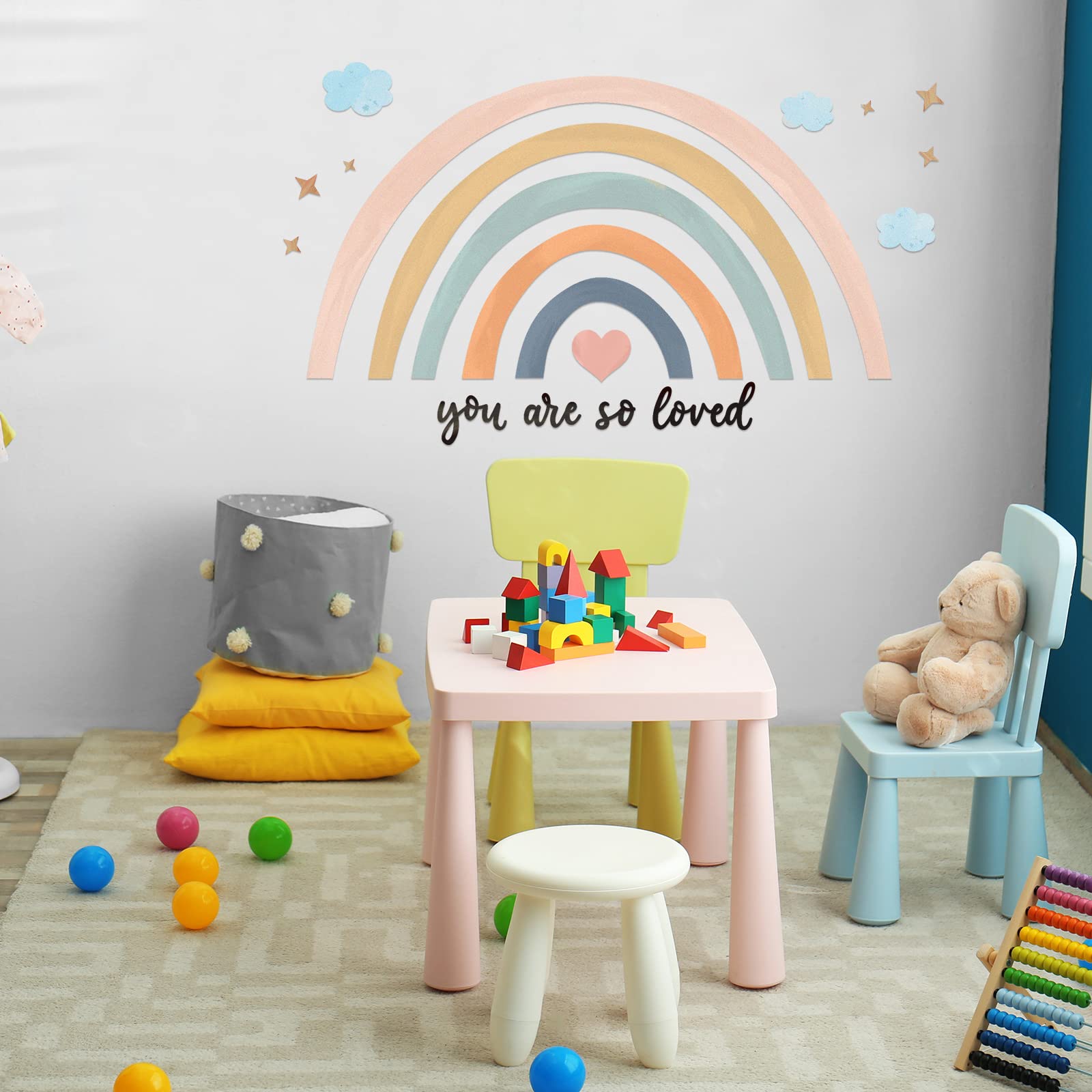 Rainbows wall decal: rainbow decor possesses many lovely elements, such as clouds, love, which is suitable for children; Each element can be arranged freely, which allows kids to use their imagination to create their own style, meanwhile this rainbow wall decals can be applied for adults too