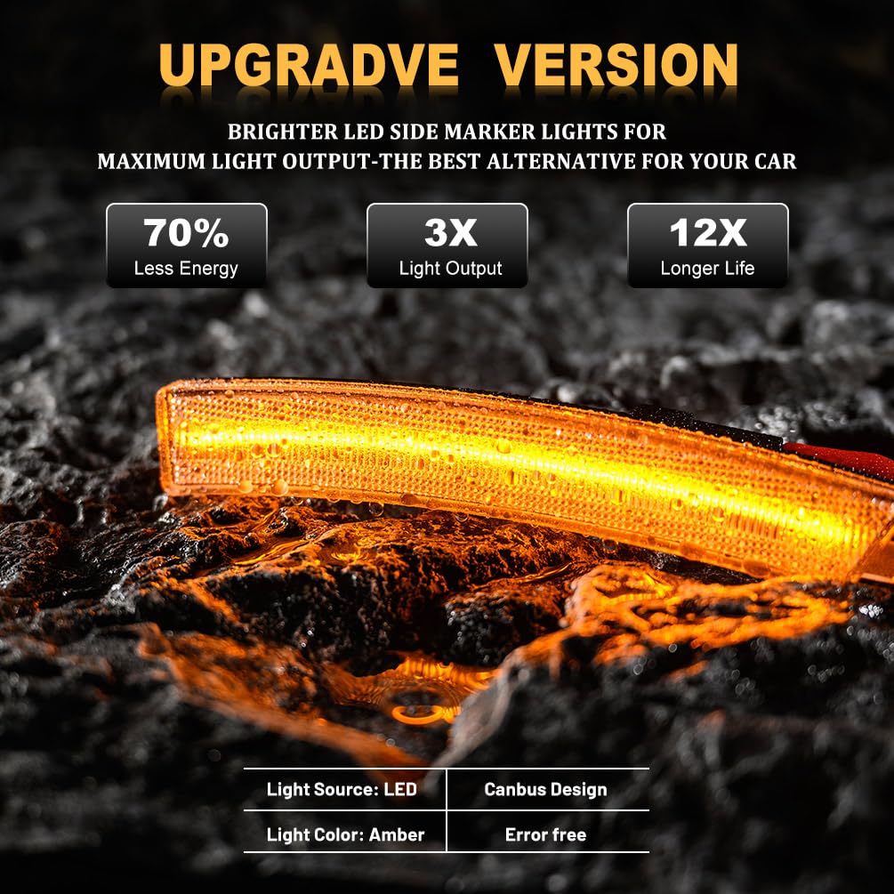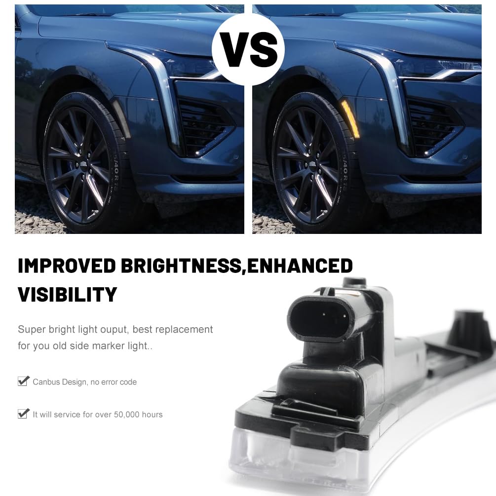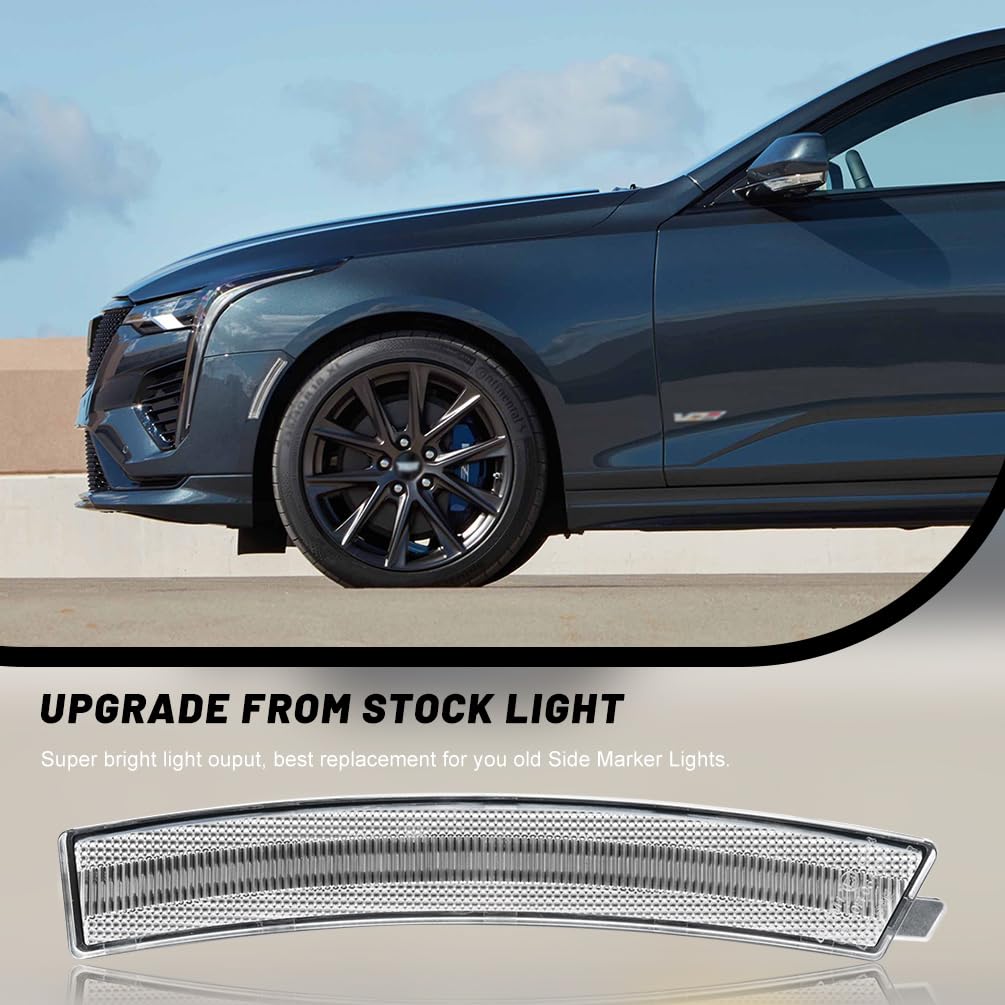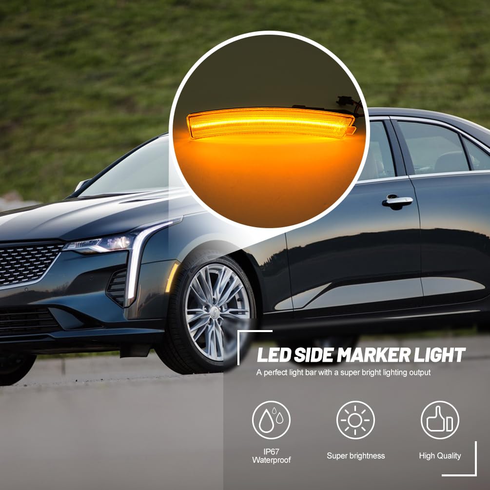 Function: Compatible with 2020 2021 2022 2023 Cadilla.c CT4. Upgrade your CT4 side markers with a new fashion style clear lens look and brighter amber LED lighting. Elevates your muscle car's aura and even adds additional safety visibility driving signal features