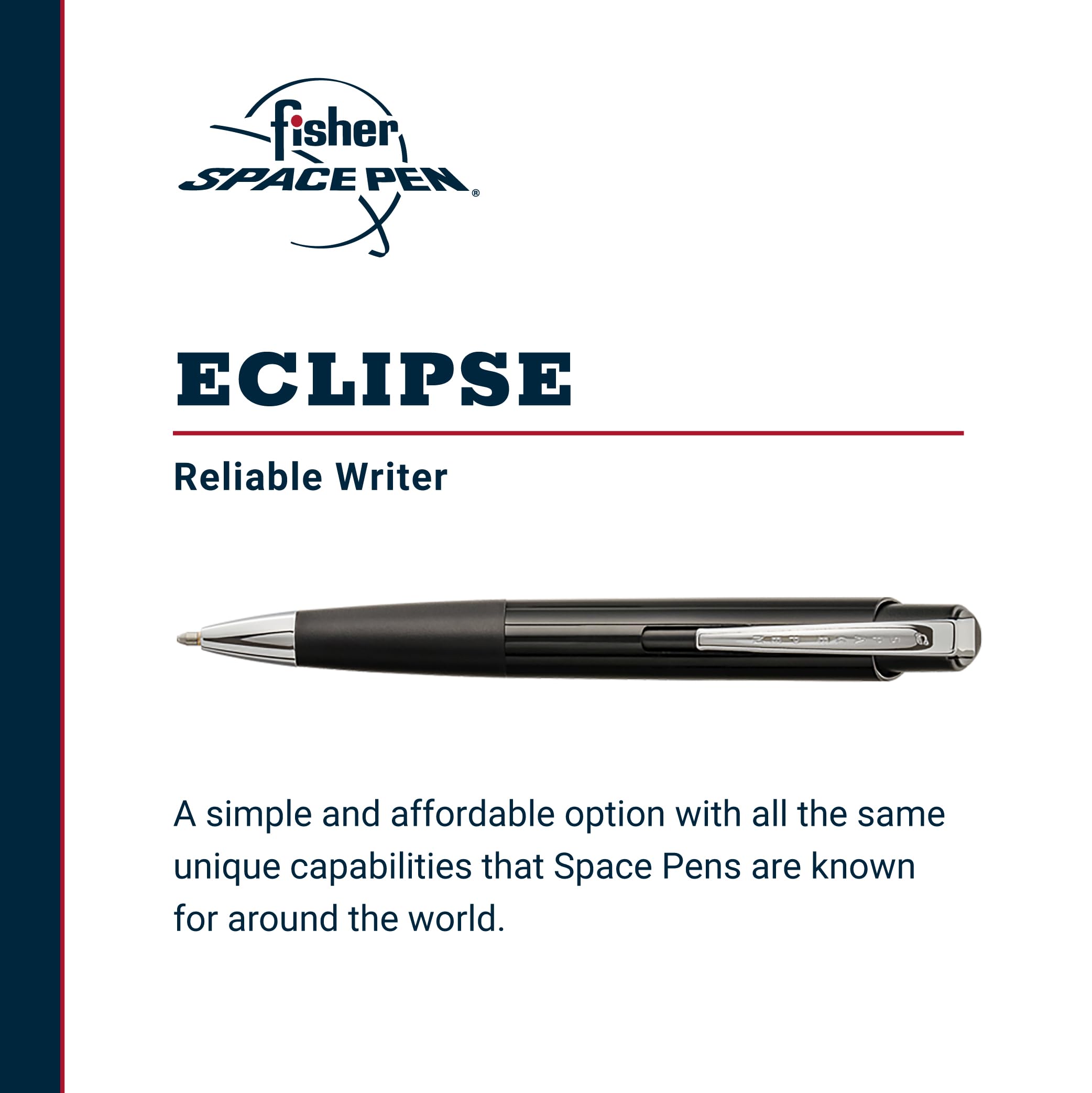 A Pen Designed to Last: The Eclipse Space Pen is a sleek, shiny, black, plastic pen with accents of contrasting matte black for the finger grip section & rear button