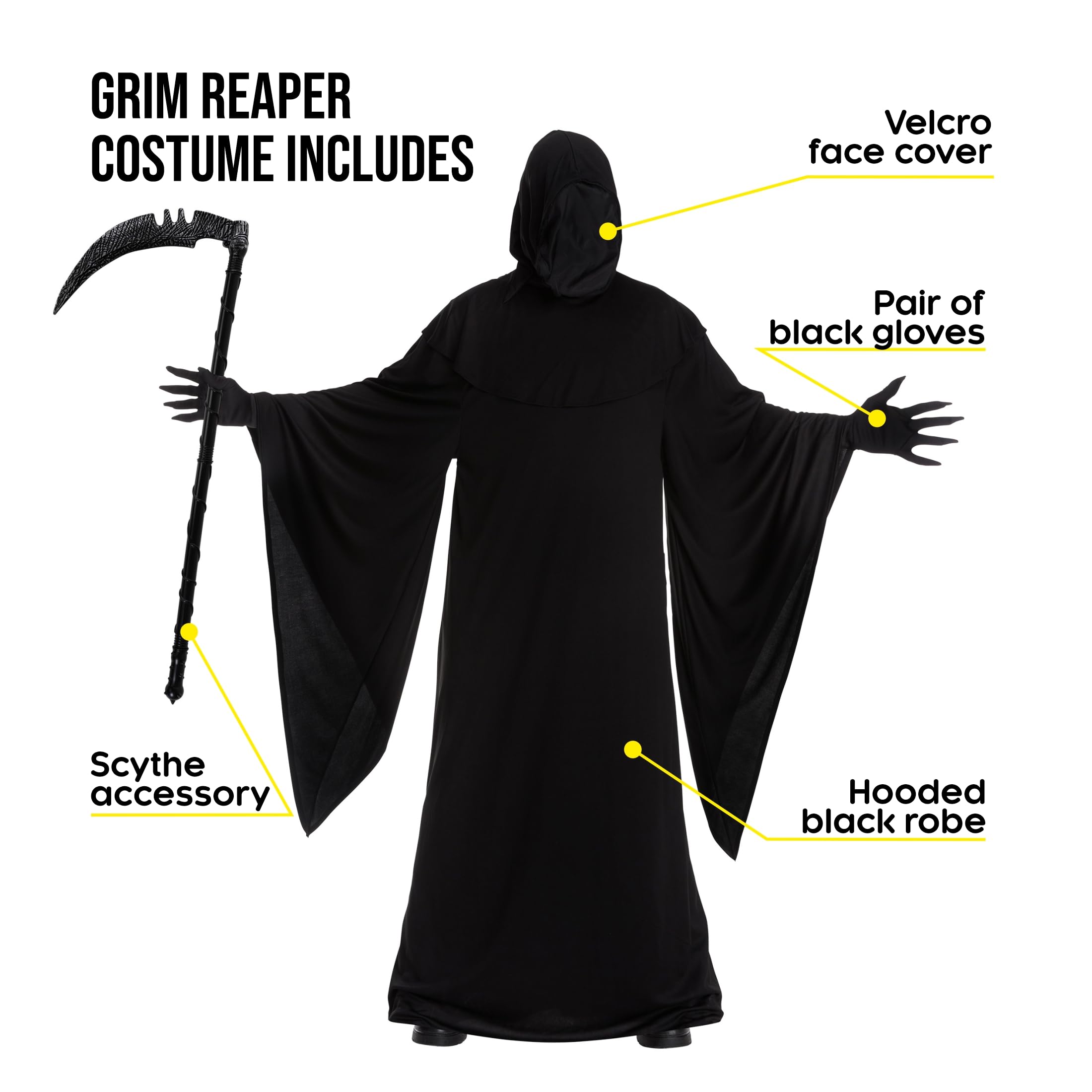 Our mens reaper costume includes: one black hooded robe, removable face cover that secures with velcro, and gloves. Also included is the reaper scythe accessory!