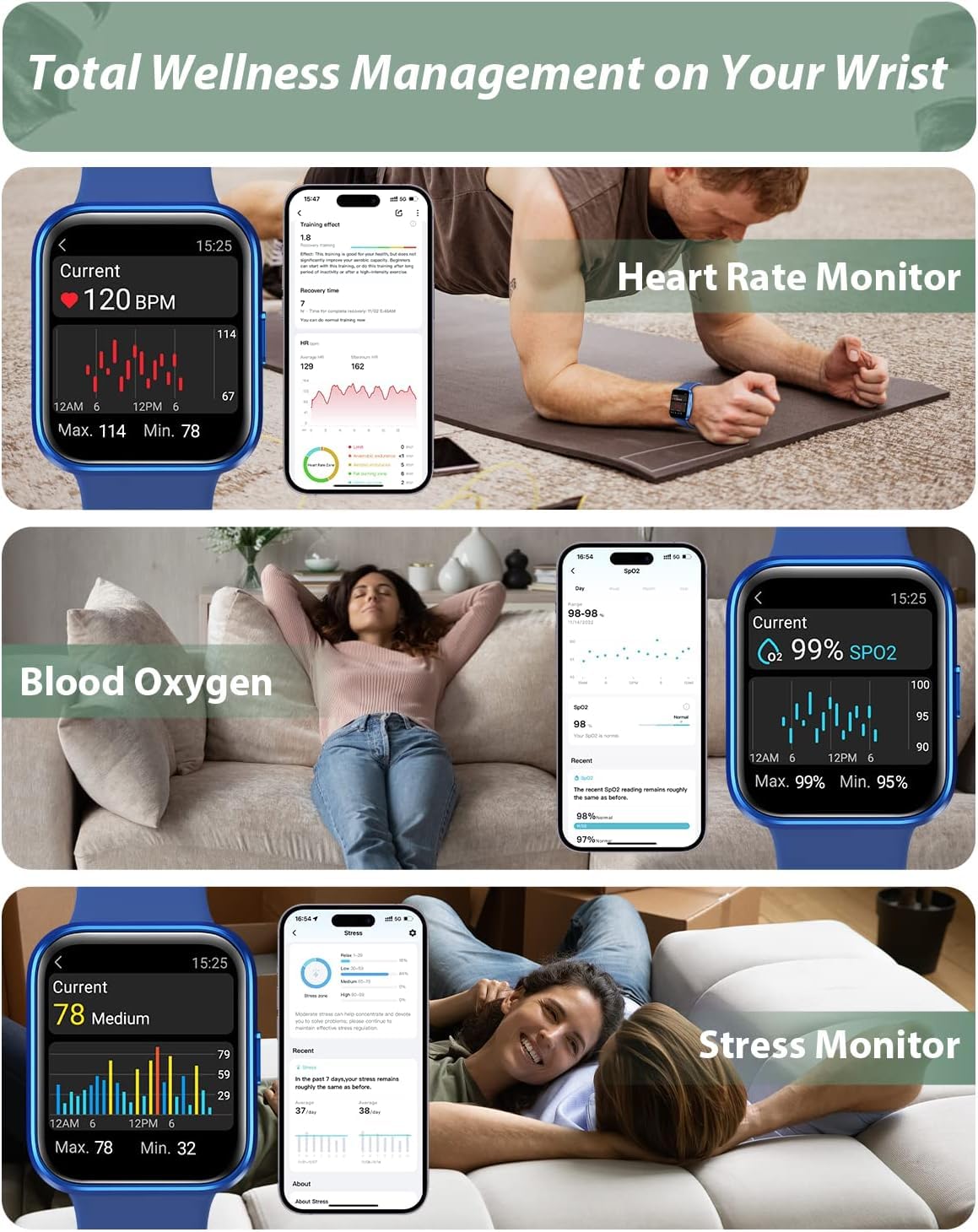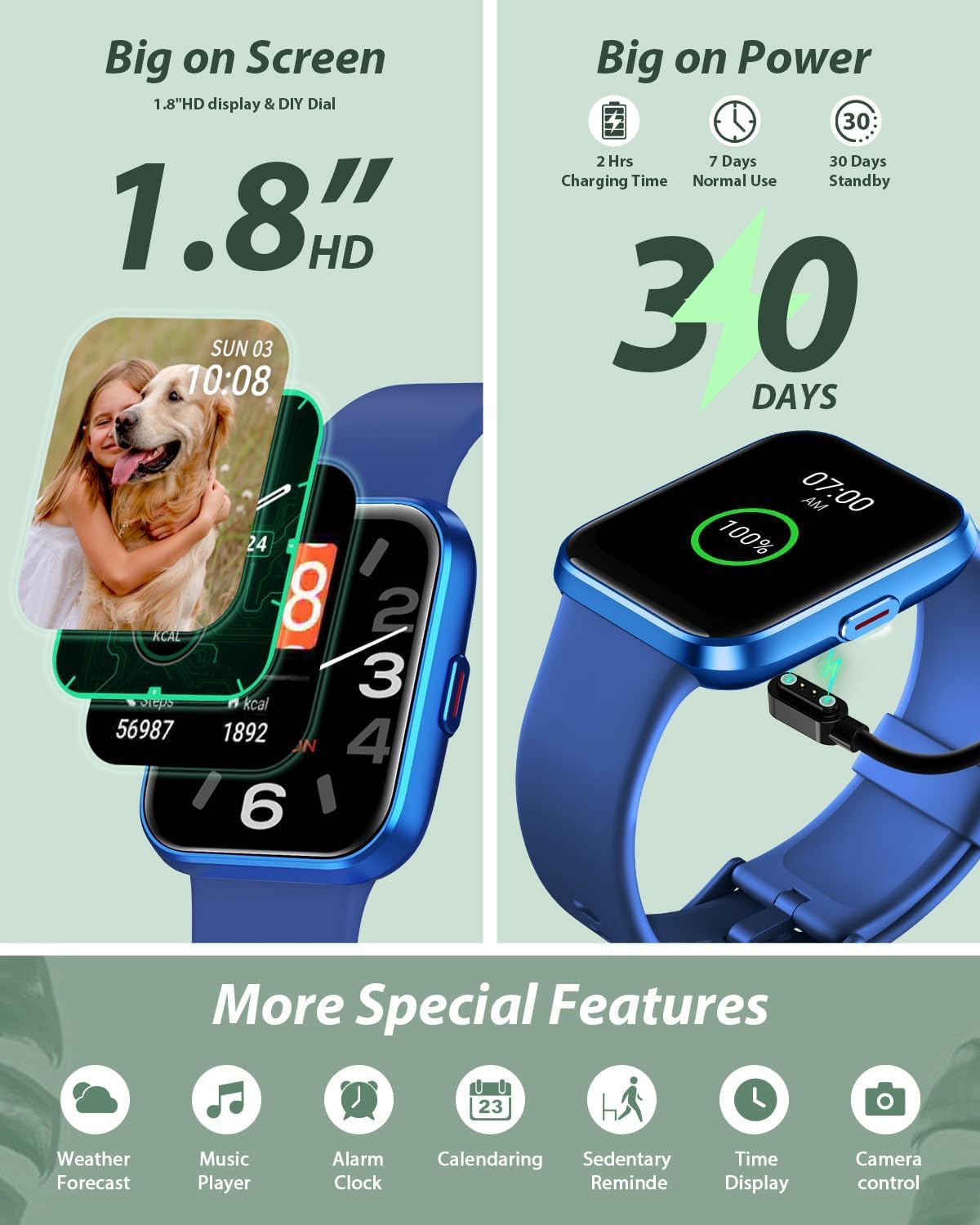 【Smart Life Partner & DIY Background】Multi-functional Smart Watch with 1.8"HD Extra-large full touch screen(Suitable for medium to large wrists) brings you a unique visual and better interactive experience. You can upload your favorite pictures as your watch faces. It contains many daily useful tools, such as Noise monitoring, Message reminder, Weather forecast, Music control, Stress monitoring, Setting alarms, Stopwatch, timer, Sedentary reminder, Breather guide, Raise to wake, Find phone, adjustable brightness and more.