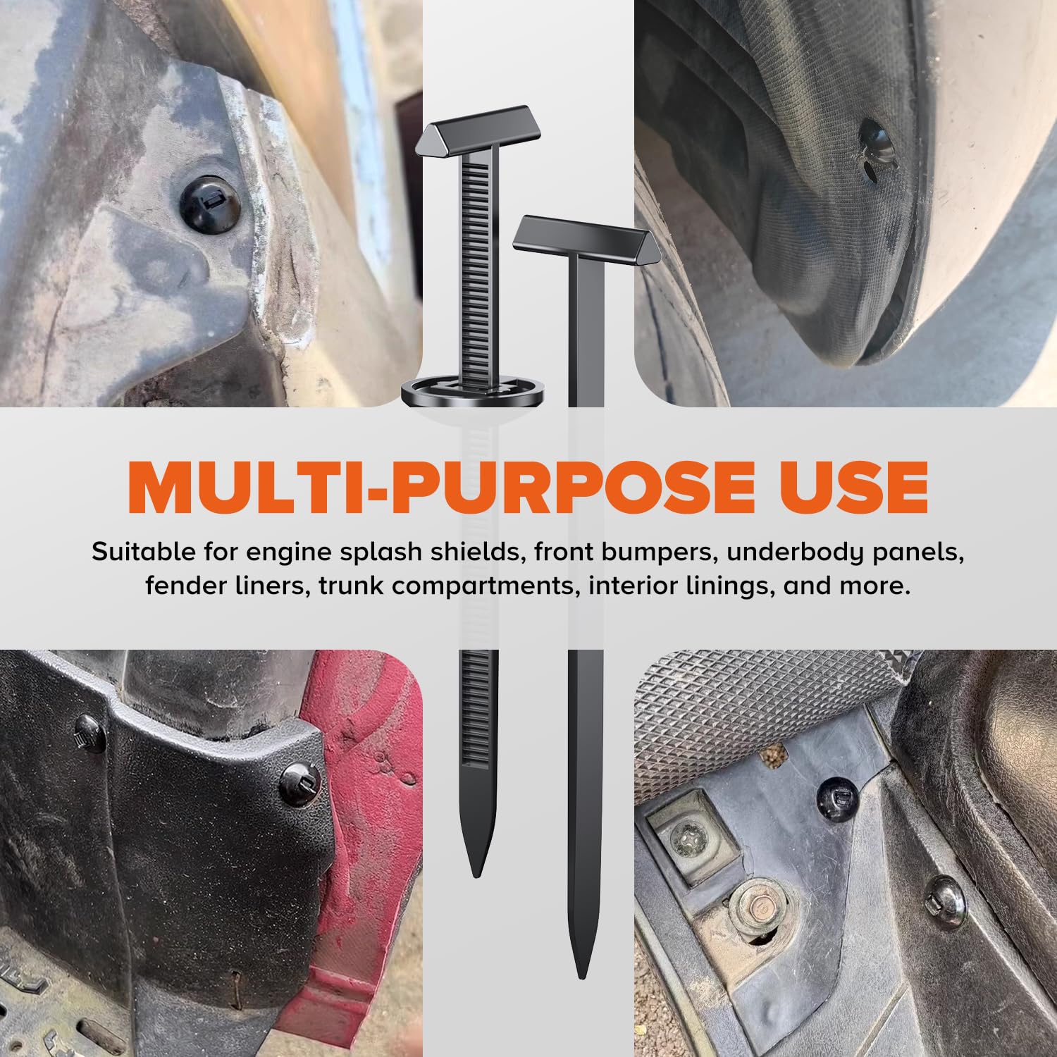 Quick & Tool-Free Installation: This snap-fit nylon fastening clip for car repairs offers two simple installation methods --① Fold the T-head and snap it into a hole (0.29 in/ 7.4mm or larger). ②Insert the tail end through a hole (0.2 in/5.08mm or larger) if space allows.Once locked in place, just trim the excess. A reliable choice of auto zip tie buckles for fast and secure fixing