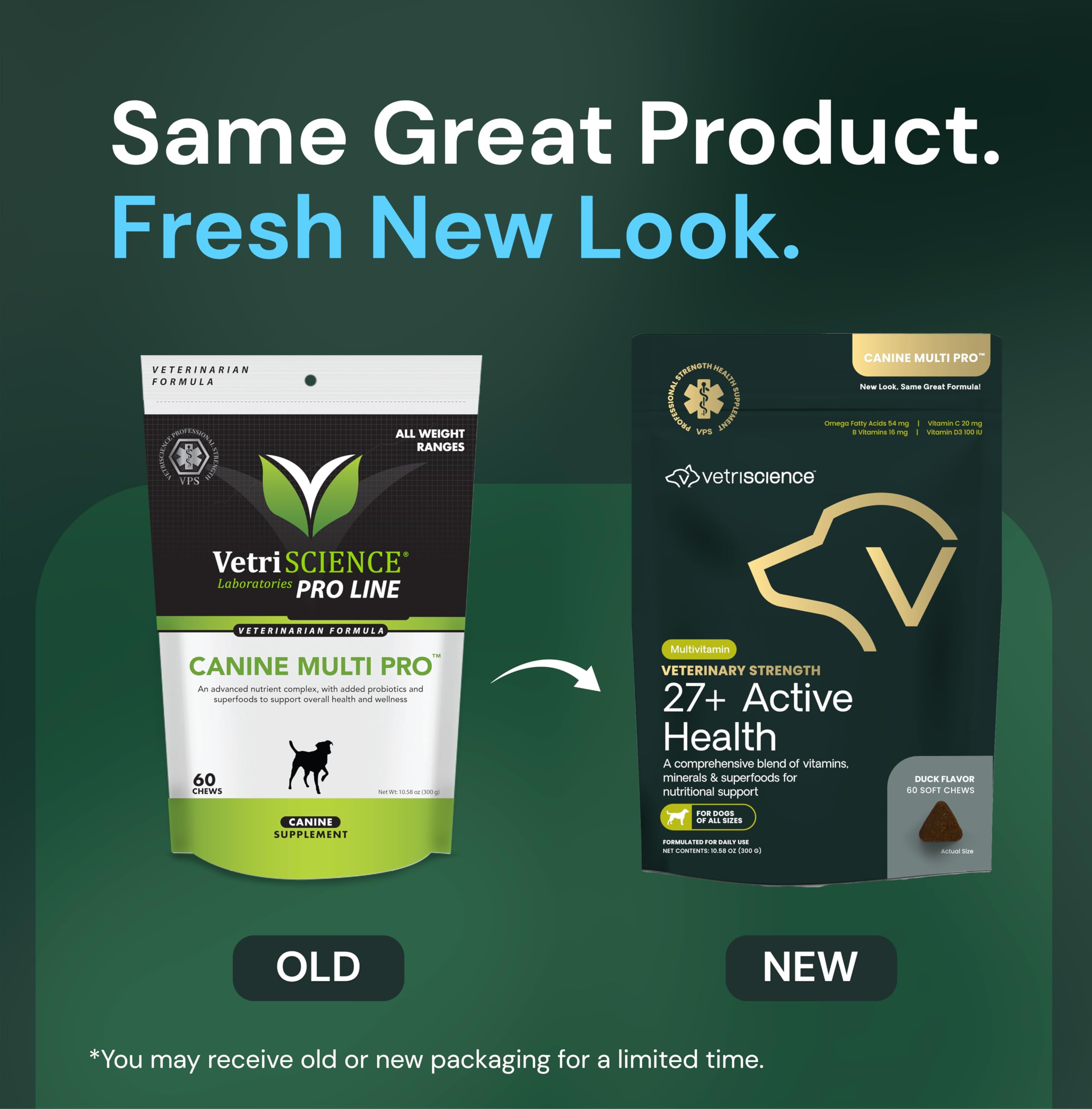 Dog Multivitamin: VetriScience Veterinary Strength 27+ Active Health Chews are a dog vitamin supplement that supports balanced nutrition to support dog health and wellness*