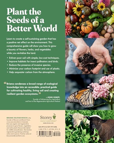 In this comprehensive handbook, Briana Bosch of Blossom and Branch Farm teaches you how to grow flowers, herbs, and vegetables in a way that improves the soil, supports pollinators and birds, and minimizes the use of store-bought products. Eco-conscious gardeners have always done their best to minimize the harm they cause—by not using synthetic pesticides or fertilizers, for example. But today's gardeners want to go beyond "do no harm" and have a positive effect on the environment. The goal of regenerative gardening is to leave the world a better place: to create living soil, improve habitats for insect pollinators and birds, reduce the presence of invasive species, minimize the gardener's carbon footprint and use of plastic, and help sequester carbon from the atmosphere. Author Briana Bosch, founder of Blossom and Branch Farm, teaches the key principles for regenerative gardening: recognize the garden as its own ecosystem, know your soil, minimize the "purchased garden," build your soil armor, plant for biodiversity, create living soil, choose plants wisely, minimize soil disturbance, and close the garden loop. In addition to teaching all the skills necessary to carry out these principles, Bosch offers a season-by-season guide to implementing them—from when to start garden cleanup in the spring (later that you'd think, to avoid disrupting overwintering beneficial insects) to how to use cover crops strategically to enrich the soil and retain moisture throughout the year.