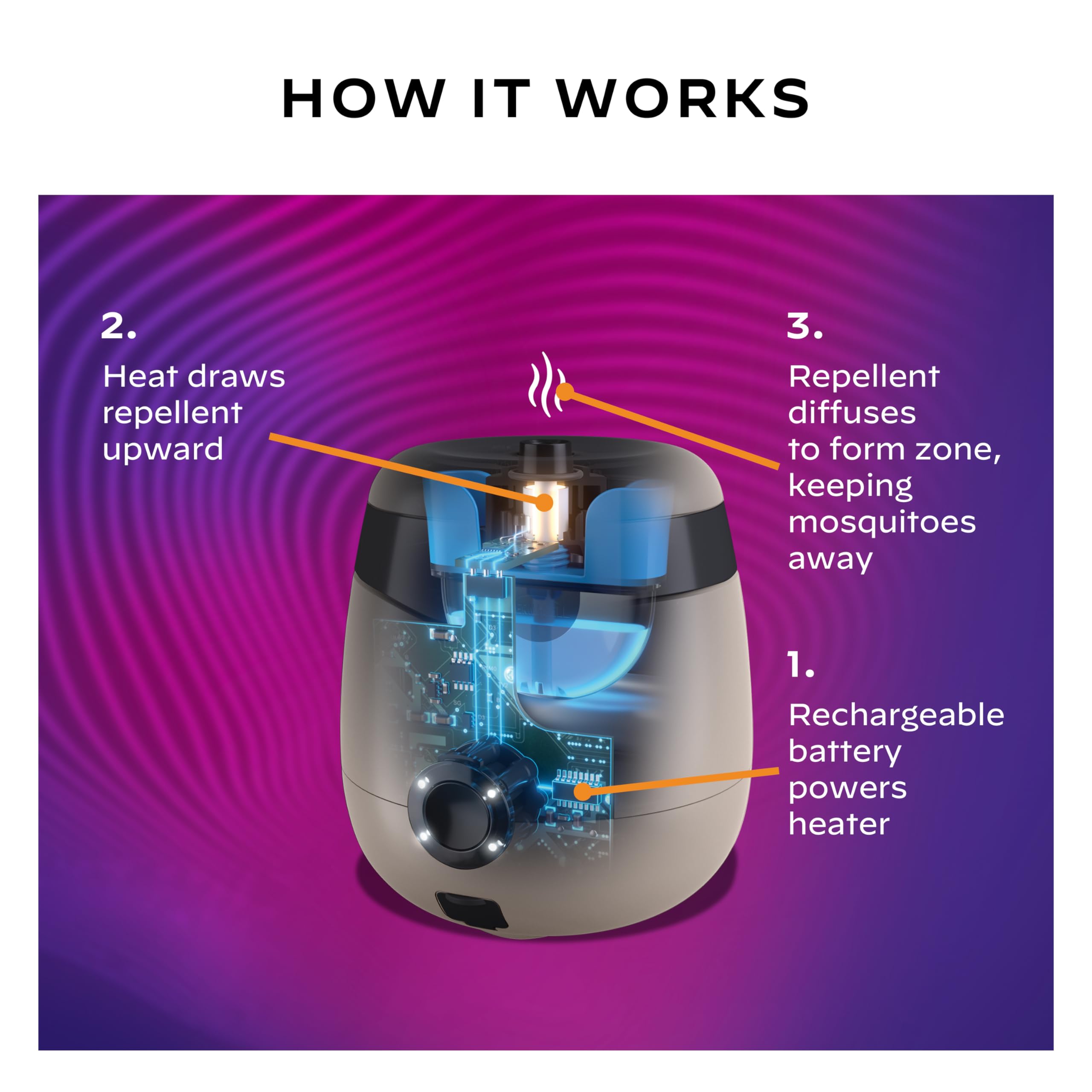 Mosquitoes ruin everything. Thermacell’s award-winning technology keeps mosquitoes away by creating a 20FT protection zone around you. Our proprietary formula precisely targets mosquito sensors, driving them away. With consistent protection that doesn't weaken over time, Thermacell helps you live your best outside life without the use of bug sprays or lotions on your skin. Features a 5.5-hour rechargeable battery. Allowed to bring on Airplanes. 12 hours of mosquito repellent included.