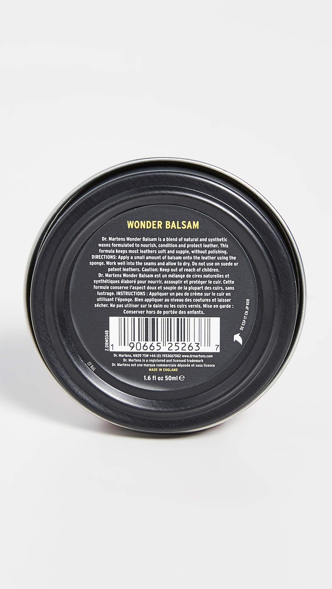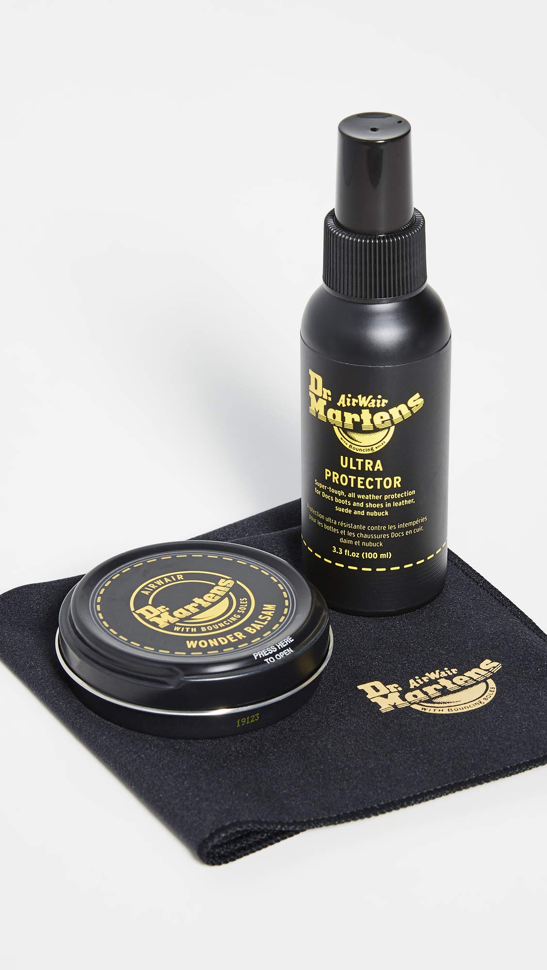 Description Keep your footwear looking up-to-date and dirt-free with the Dr. Martens® Kit 1. Shoe care kit contains the following: • 50ml Wonder Balsam - features an exclusive blend of natural and synthetic waxes formulated to nourish, condition and protect leather. • 100ml Ultra Protector spray - provides an invisible, breathable layer of protection against dirt, rain, UV-rays and stains. • One Dr. Martens-branded soft buffing cloth - easily removes dirt, marks and residue. Imported.