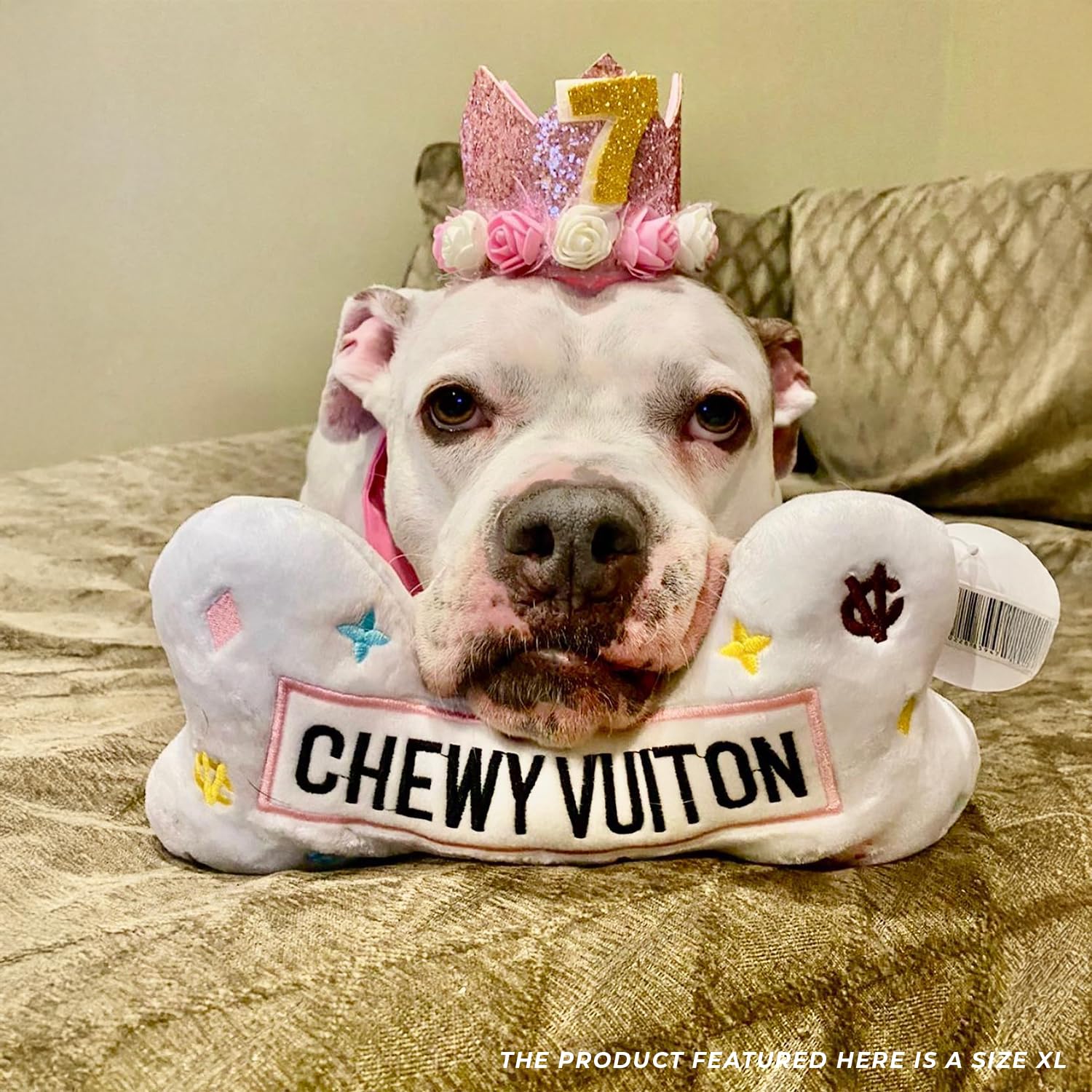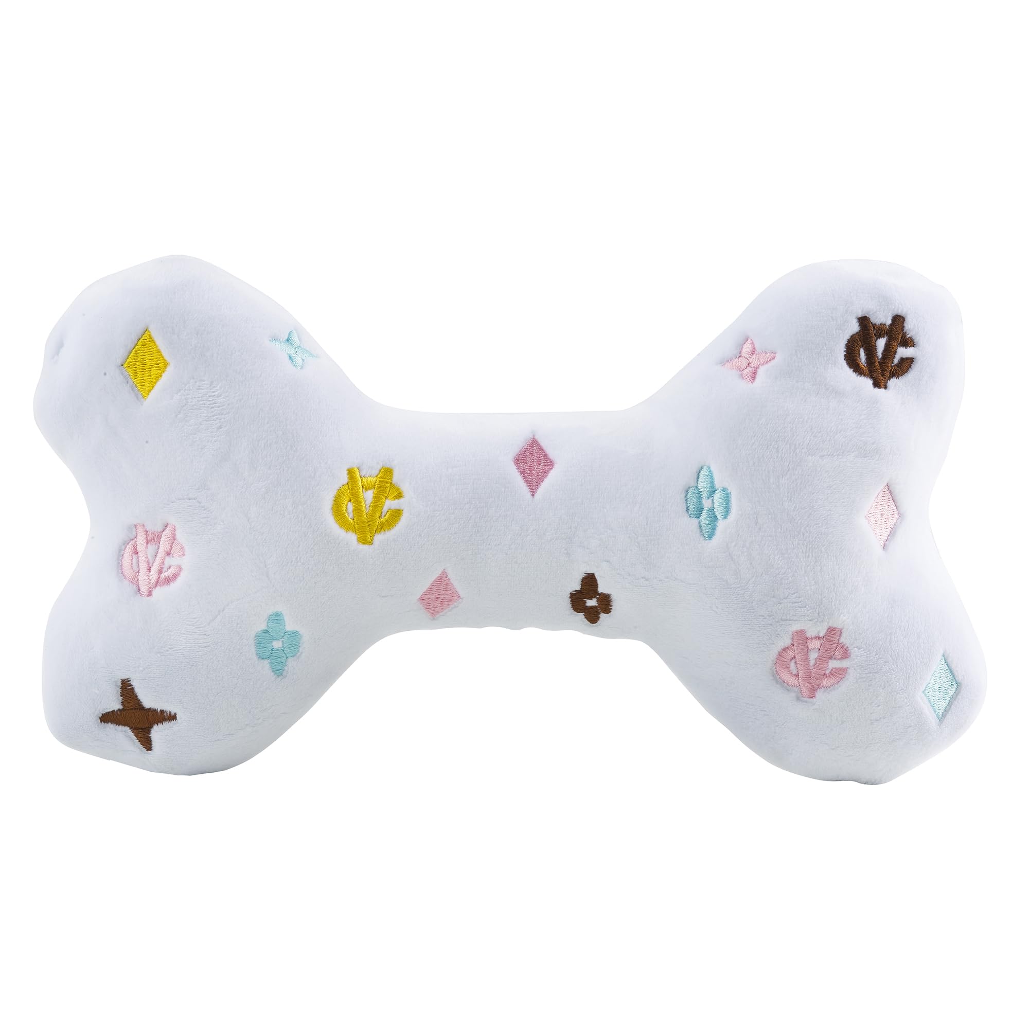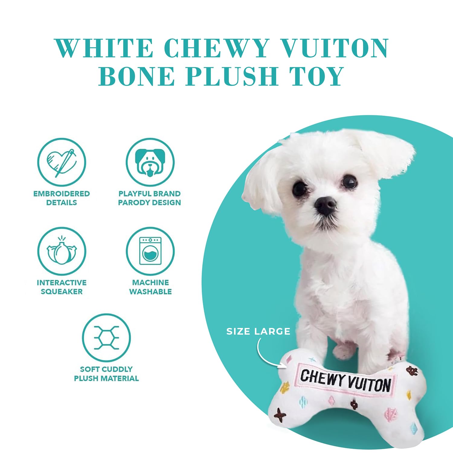 Funny Parody Plush Dog Toy: Let your furry fashionista fetch some fashion-forward fun with this White Chewy Vuiton Bone dog plush toy, featuring an iconic white with a multicolor monogram pattern on the soft plush exterior, a built-in squeaker hidden inside, and a durable mesh lining for added strength, making it suitable for aggressive chewers; it’s a playful, cute squeaky dog toy that combines style and fun, measuring 9"x6”x1.5”