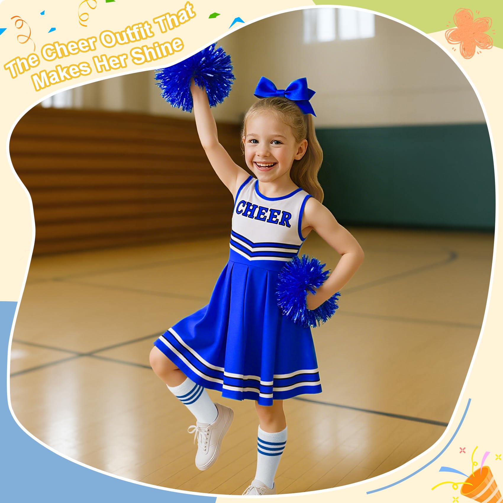 Description The cheerleader outfit is suitable for girls aged 5-12 years old. Value Set: The cheerleader costume for girls includes 1 piece of cheerleader dress, 2 piece of hair bow, 1 pair of cheerleading pom poms, and 1 pair of striped socks, can meet your need of daily use, Halloween cosplay use, and the thoughtful set will save you much time for matching.