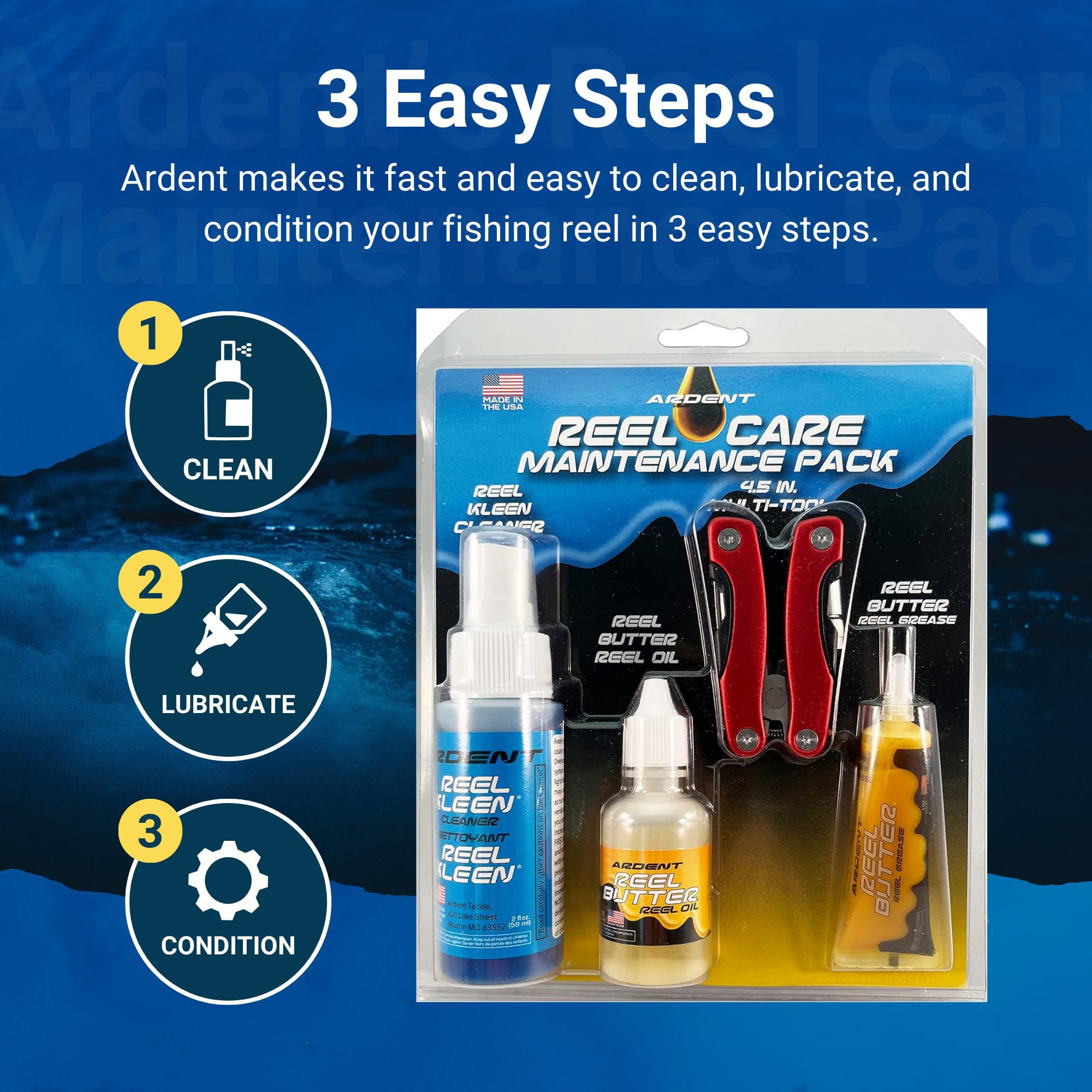 Fishing Reel Care Solution: Keep your fishing reels performing at their best with this Reel Care Pack, featuring Reel Butter Grease, Reel Butter Oil, Reel Kleen Cleaner, and a versatile 4.5-inch Multi-Tool to help to keep your gear maintain peak condition