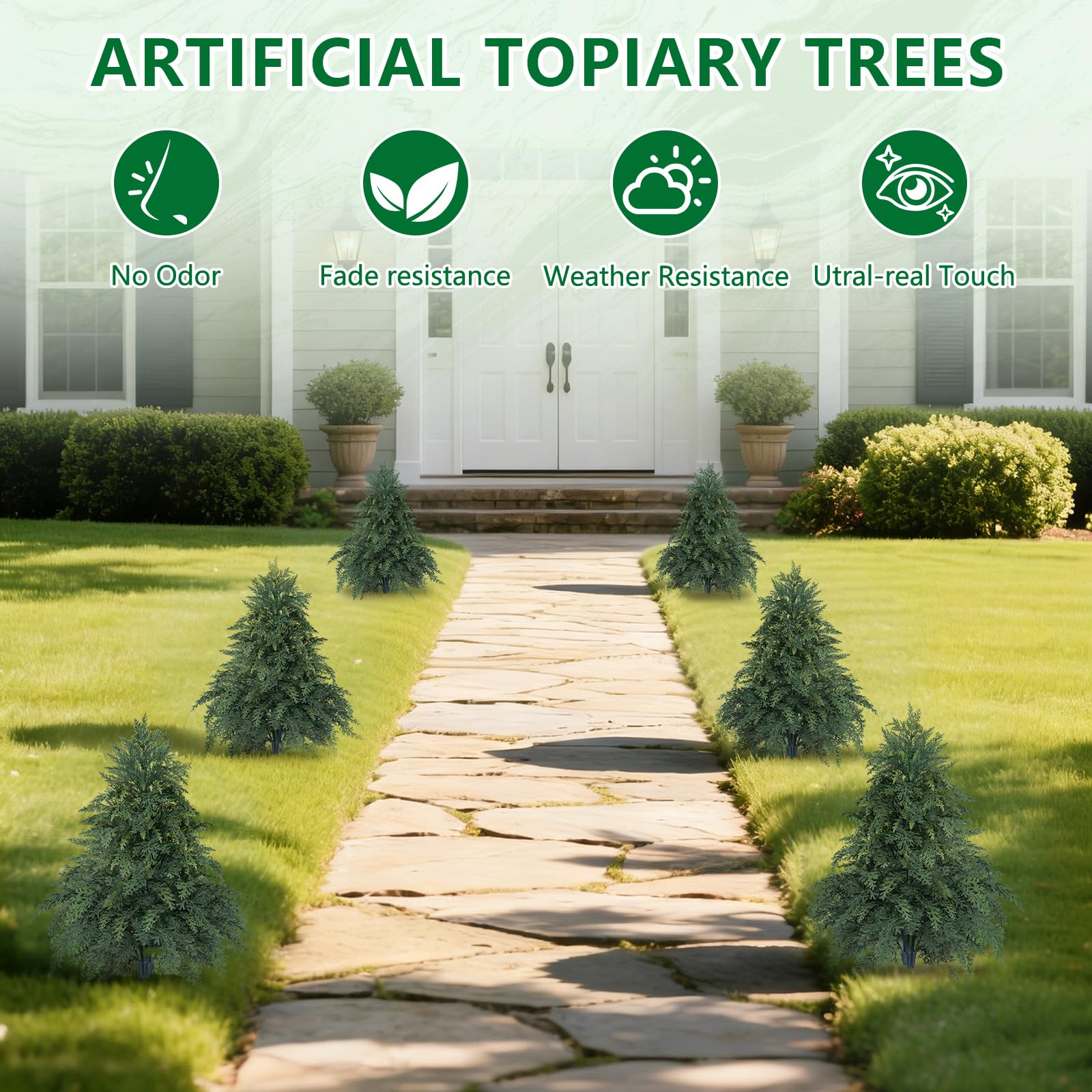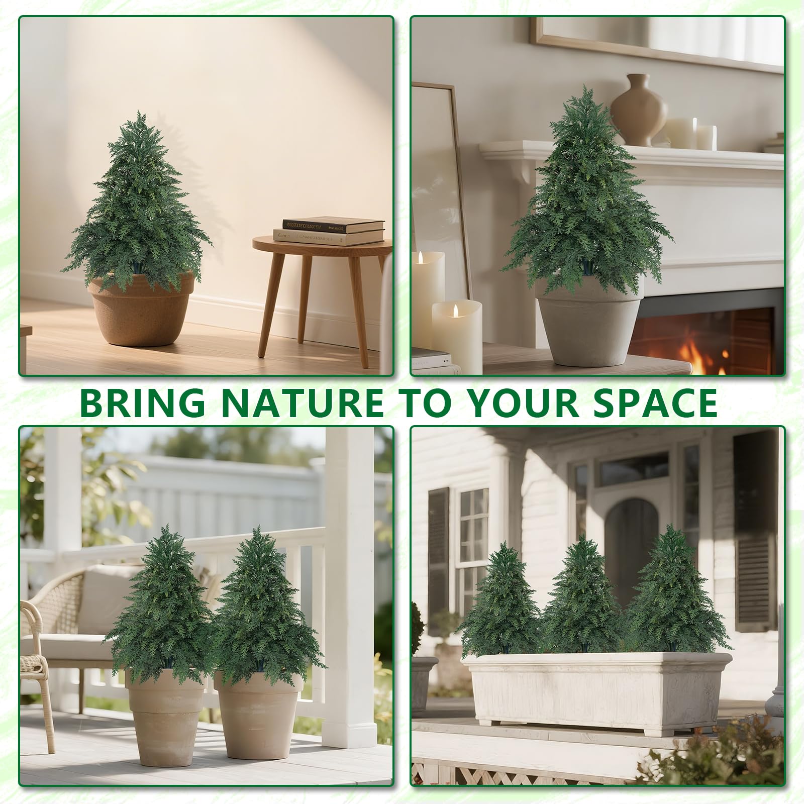 【Faux Cedar, Real Beauty】This 24inches elegant topiary features a lifelike cedar design that instantly elevates both indoor and outdoor spaces. Complete with a sturdy ground spike, it installs securely in soil or decorative planters. Its natural form brings vitality and artistic charm to any setting
