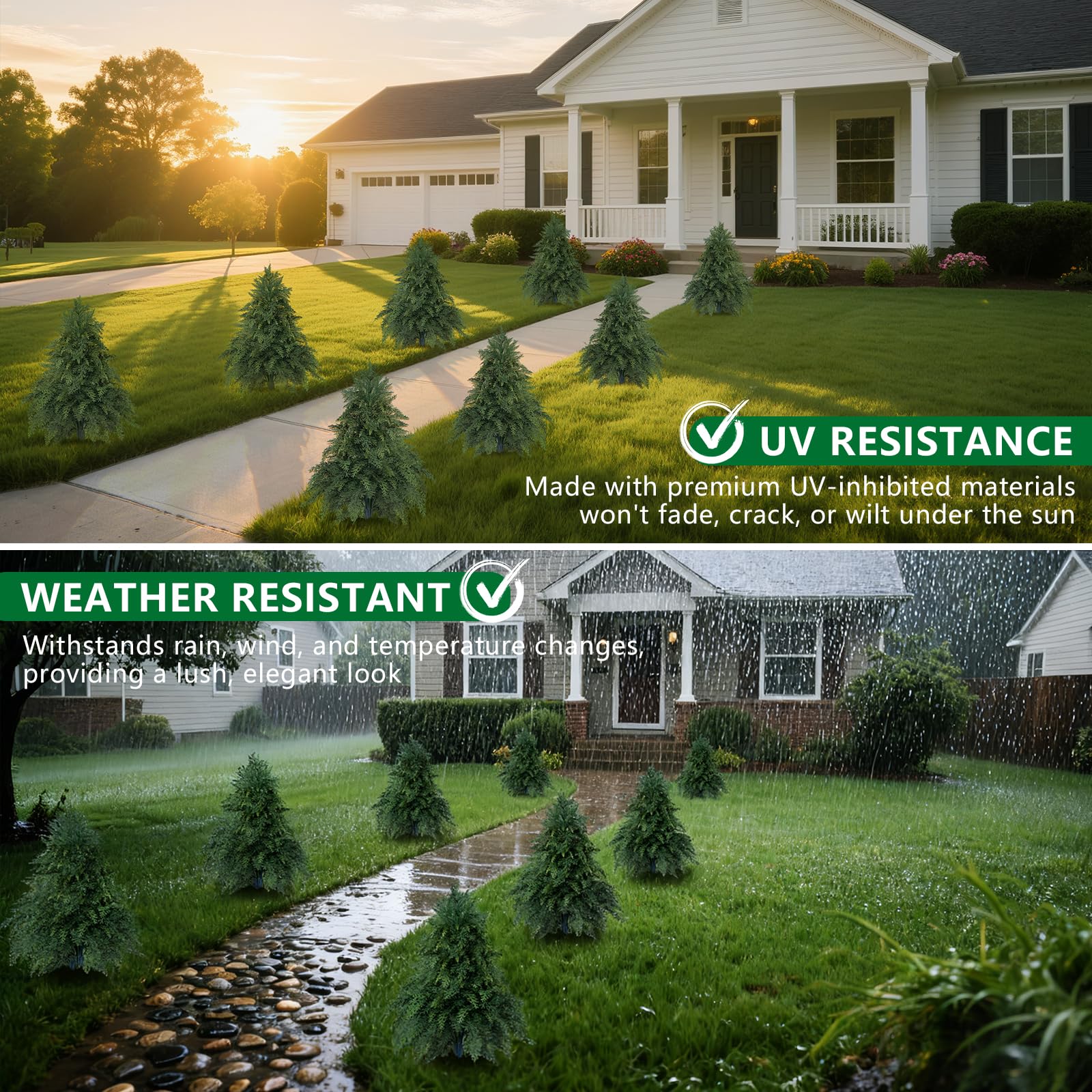 【Blends with Many Styles】 The 2 pack evergreen bushes blend seamlessly with modern, rustic, or classic European design themes. Perfect for year-round use in gardens, patios, balconies, and porches, it stays elegantly green in all seasons