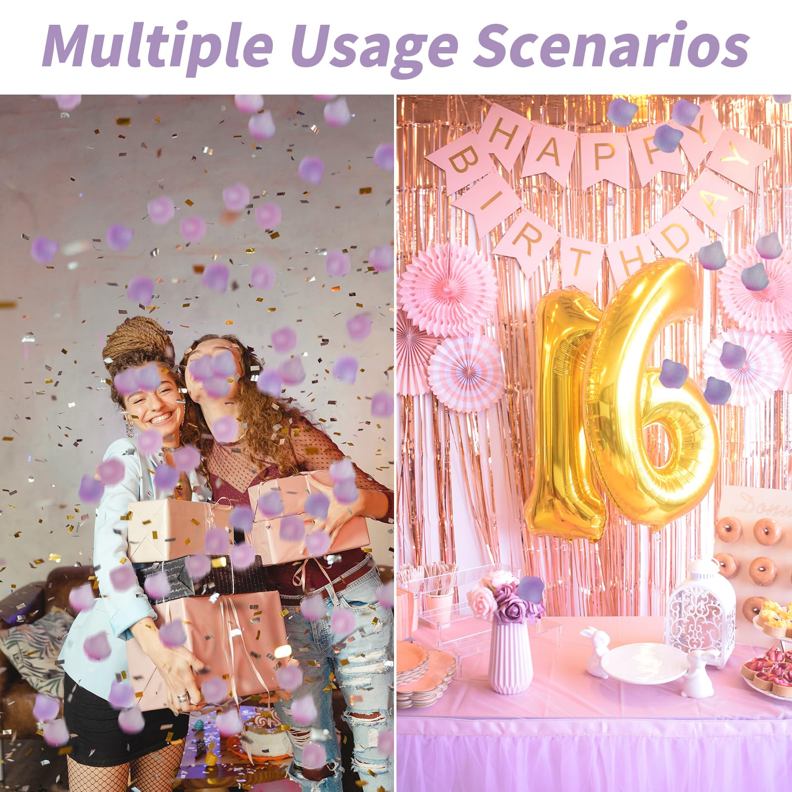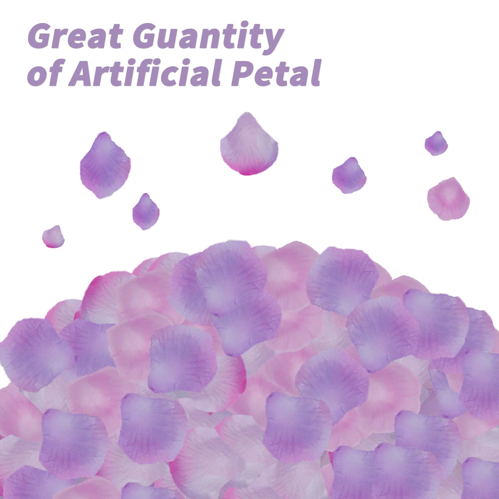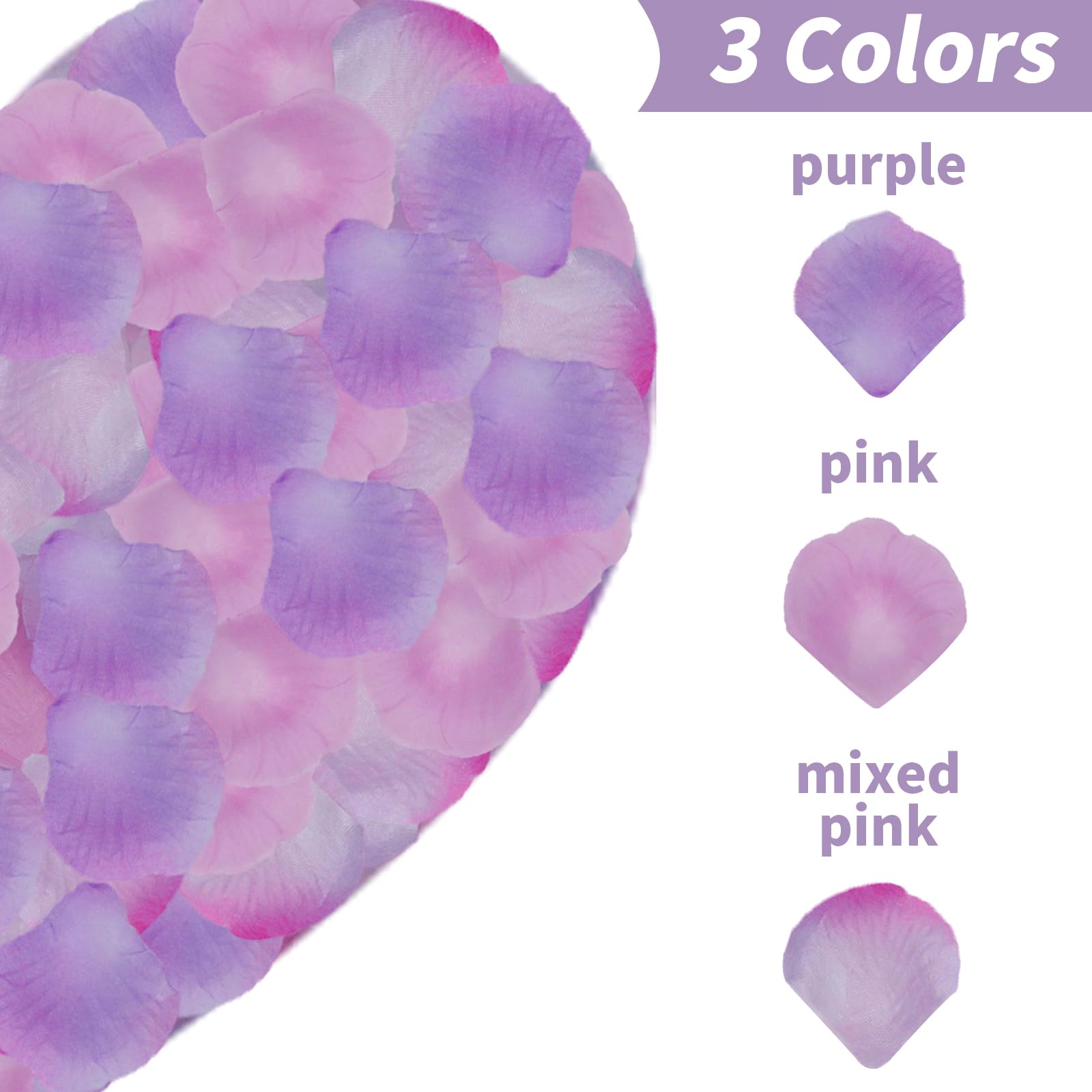 Package Include:This product contains 1200 rose petals,available in three colors:pink,white,and purple.Each color has 400 petals,and the size of each petal is approximately 5 * 5cm/1.95 * 1.95 inches.