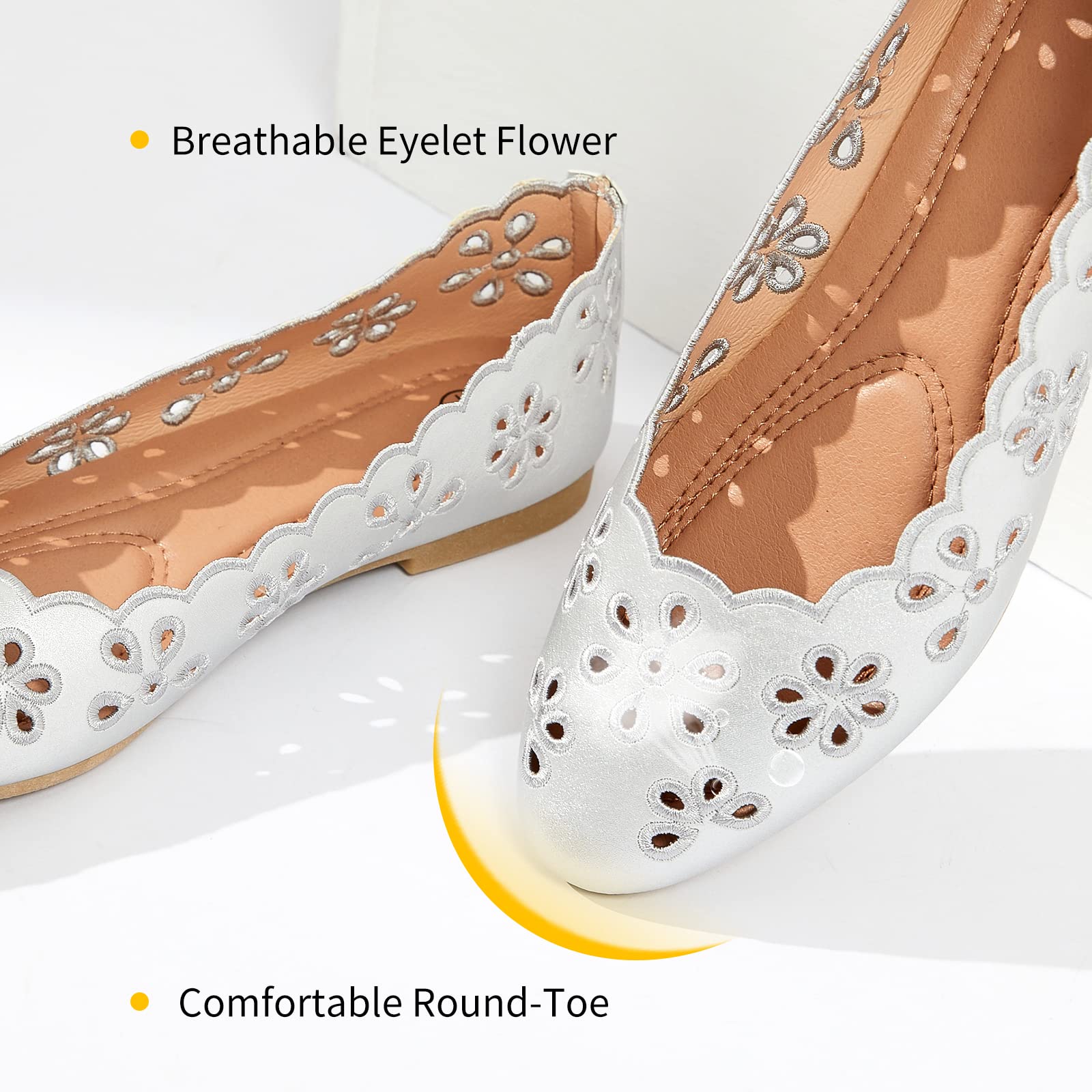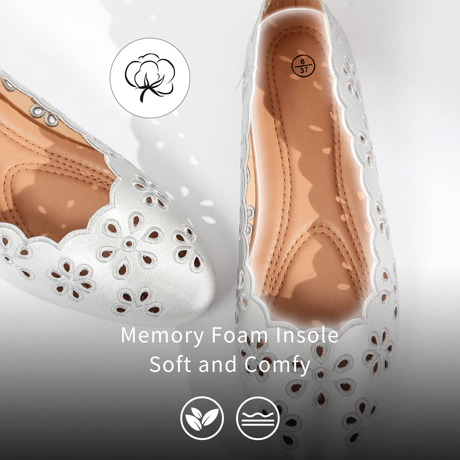 A little titht,wide feet pls size up!【Breathable & Soft】Womens Ballet Flats are made of PU Leather Upper with Breathable Eyelets,you will feel Breathable while walking all day.Fit with Padded Memory Foam Insole like walking in a cloud.
