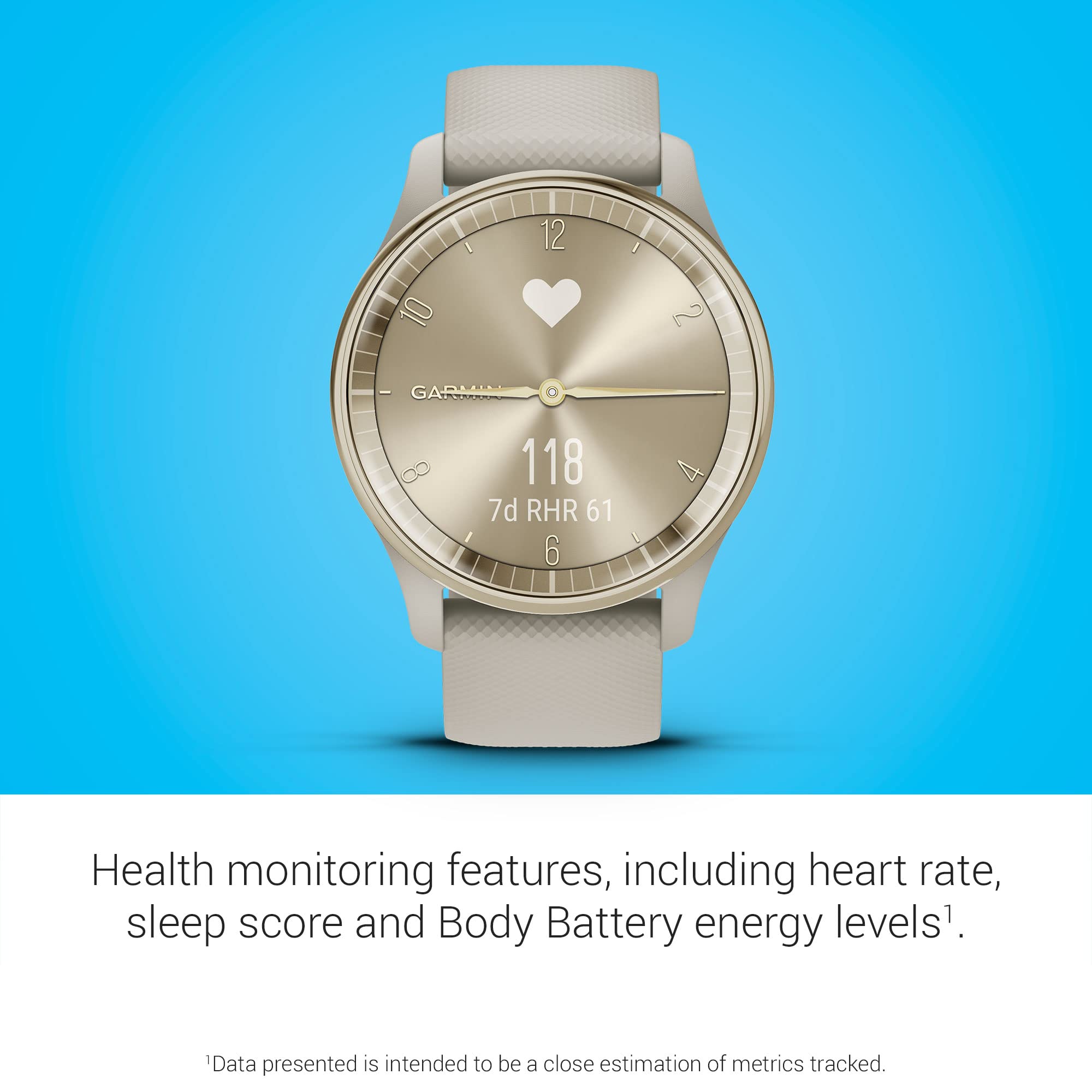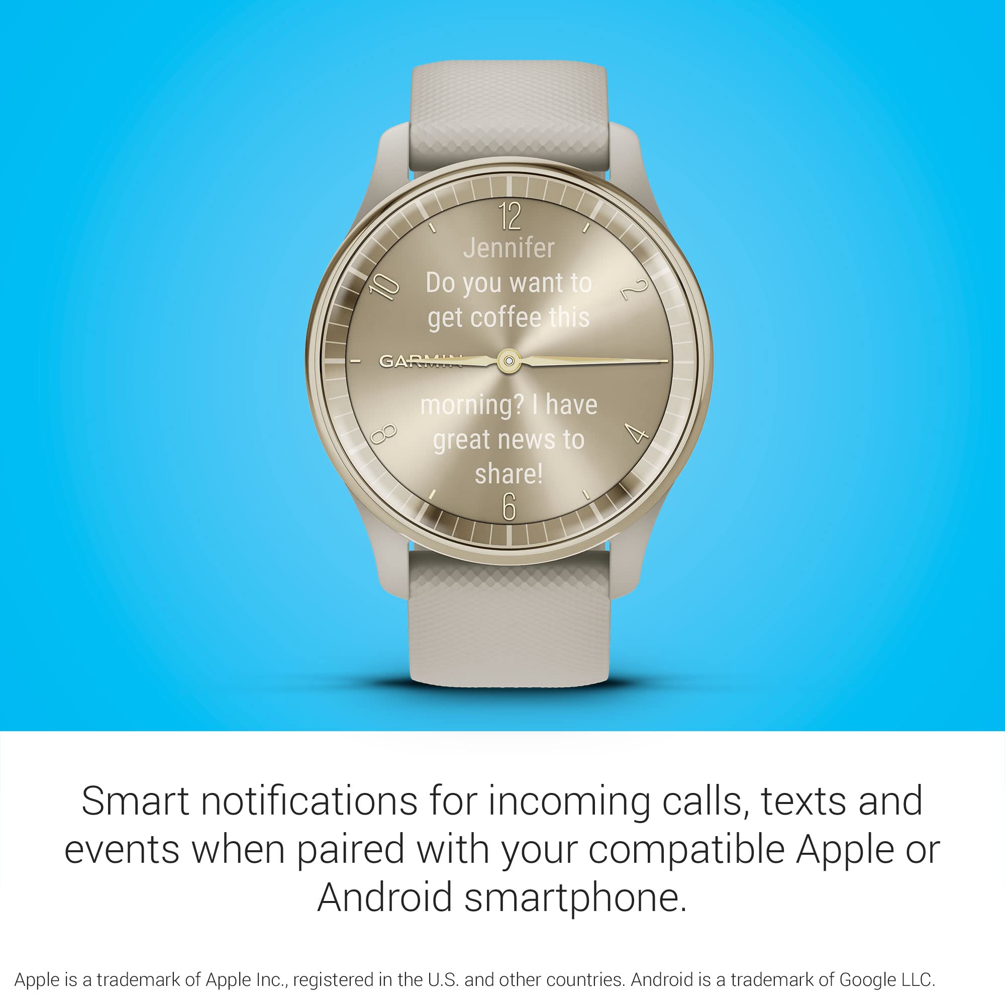 The Garmin Vivomove Trend hybrid smartwatch has a stainless steel bezel, cream gold case, gray silicone band, and adjustable sizing.