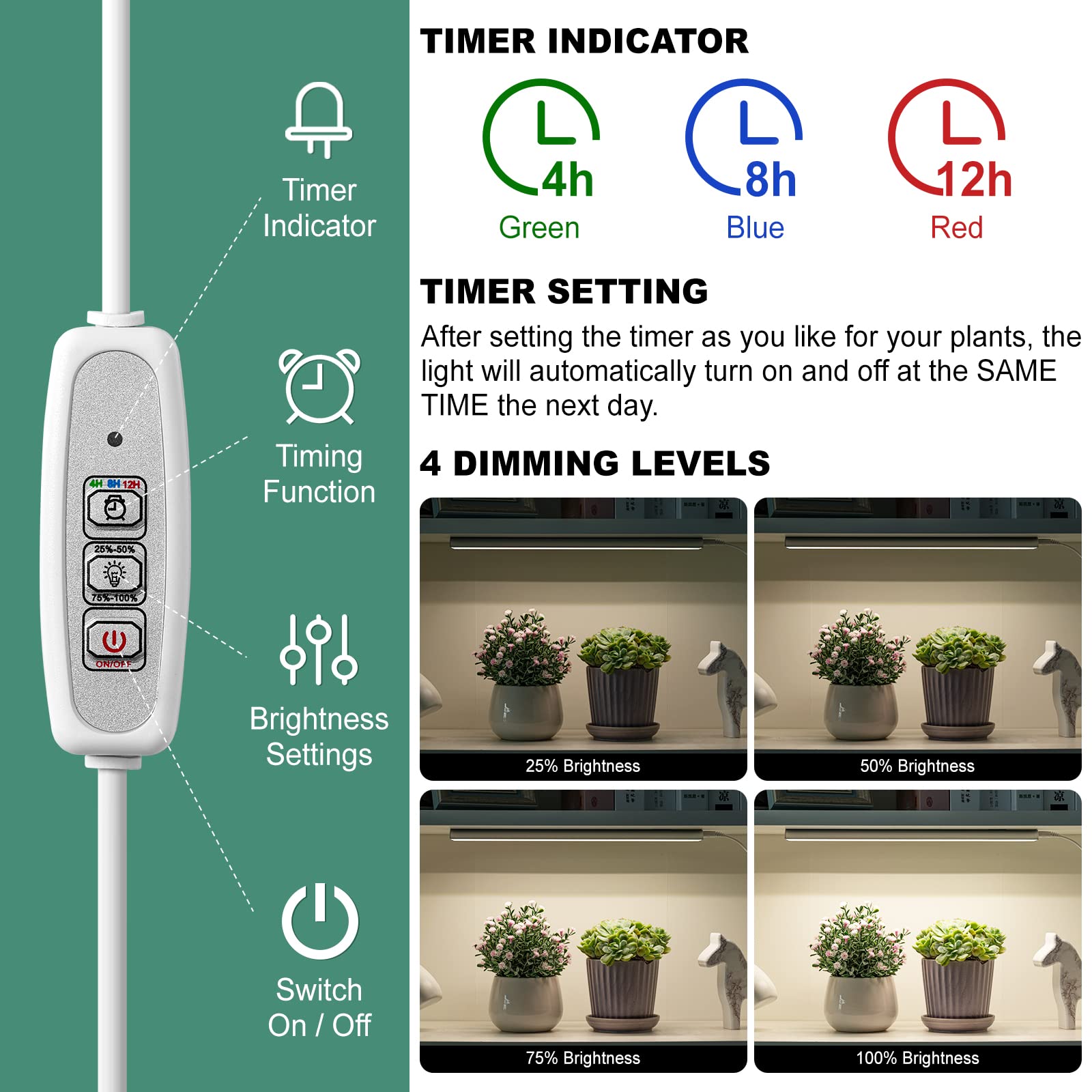 Timer Function & Auto On/Off: This LED plant lamp has a circular storage timer function and can be set to 4, 8, 12 hours as the plant needs. After setting the time, it will automatically turn on and off at the same time the next day, no need to unplug/re-plug. It will take good care of your plants while you are at work or on vacation, easy & convenient!