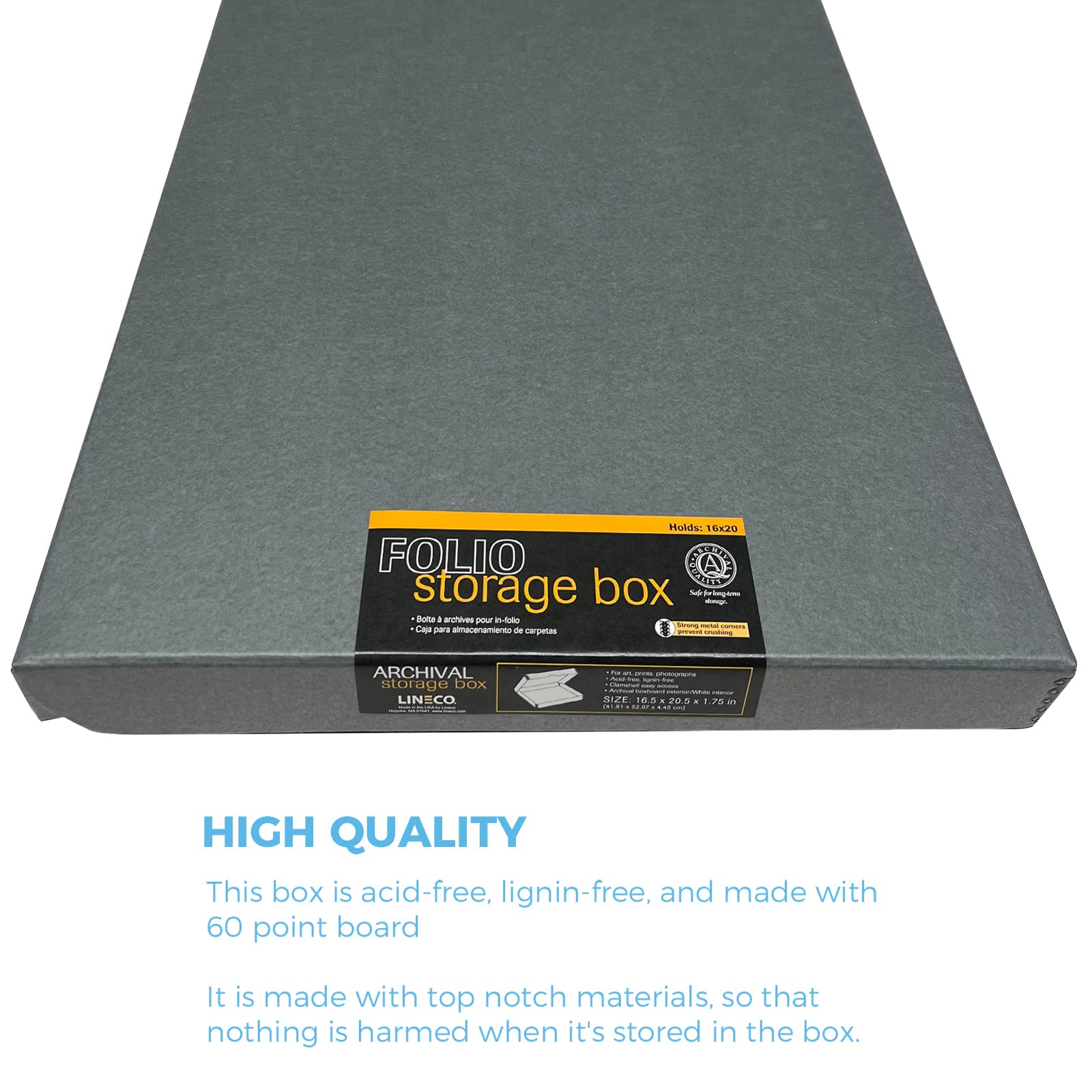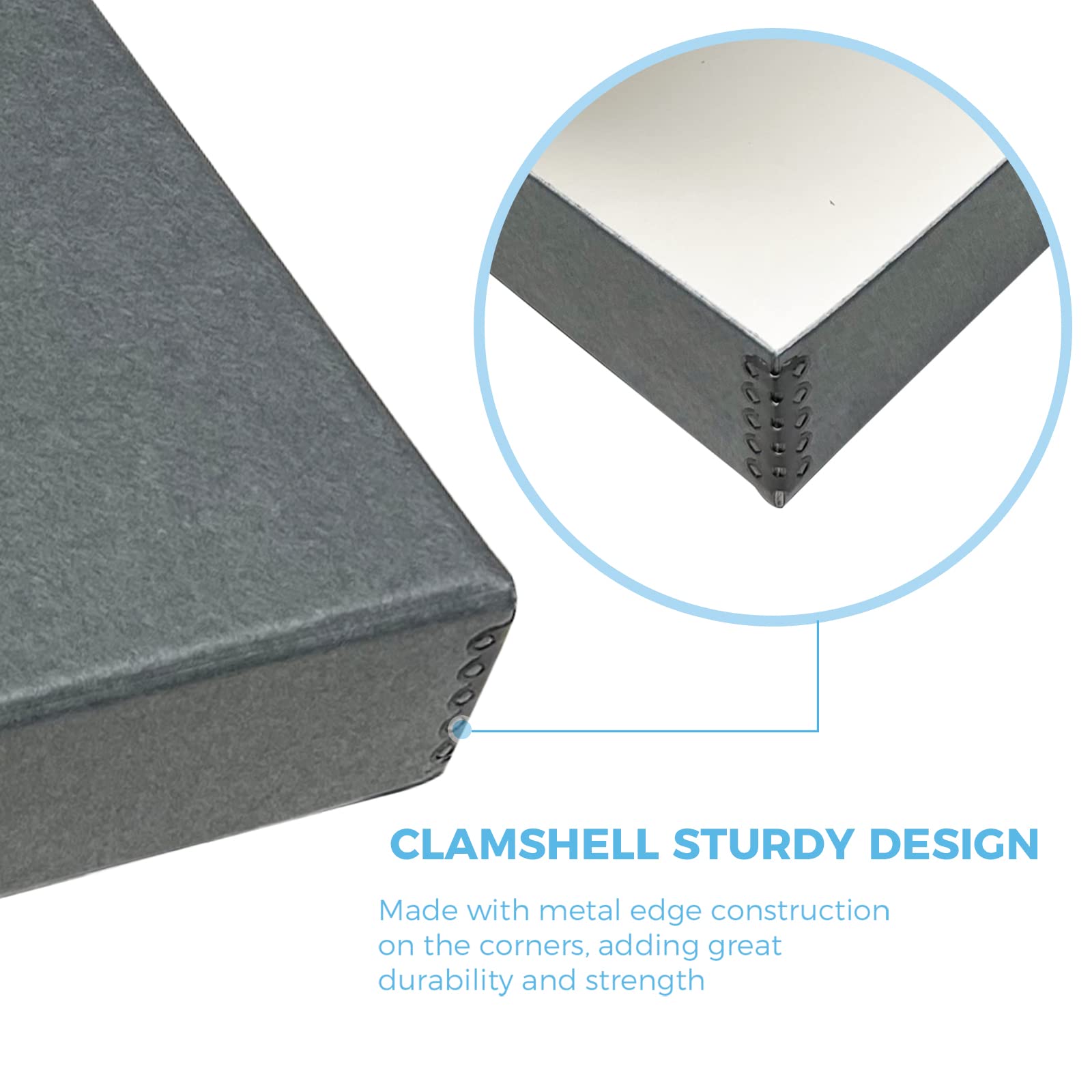 Acid-free and Lignin-free boxes manufactured in the US from Gray 60pt archival boxboard with metal edge construction for additional strength