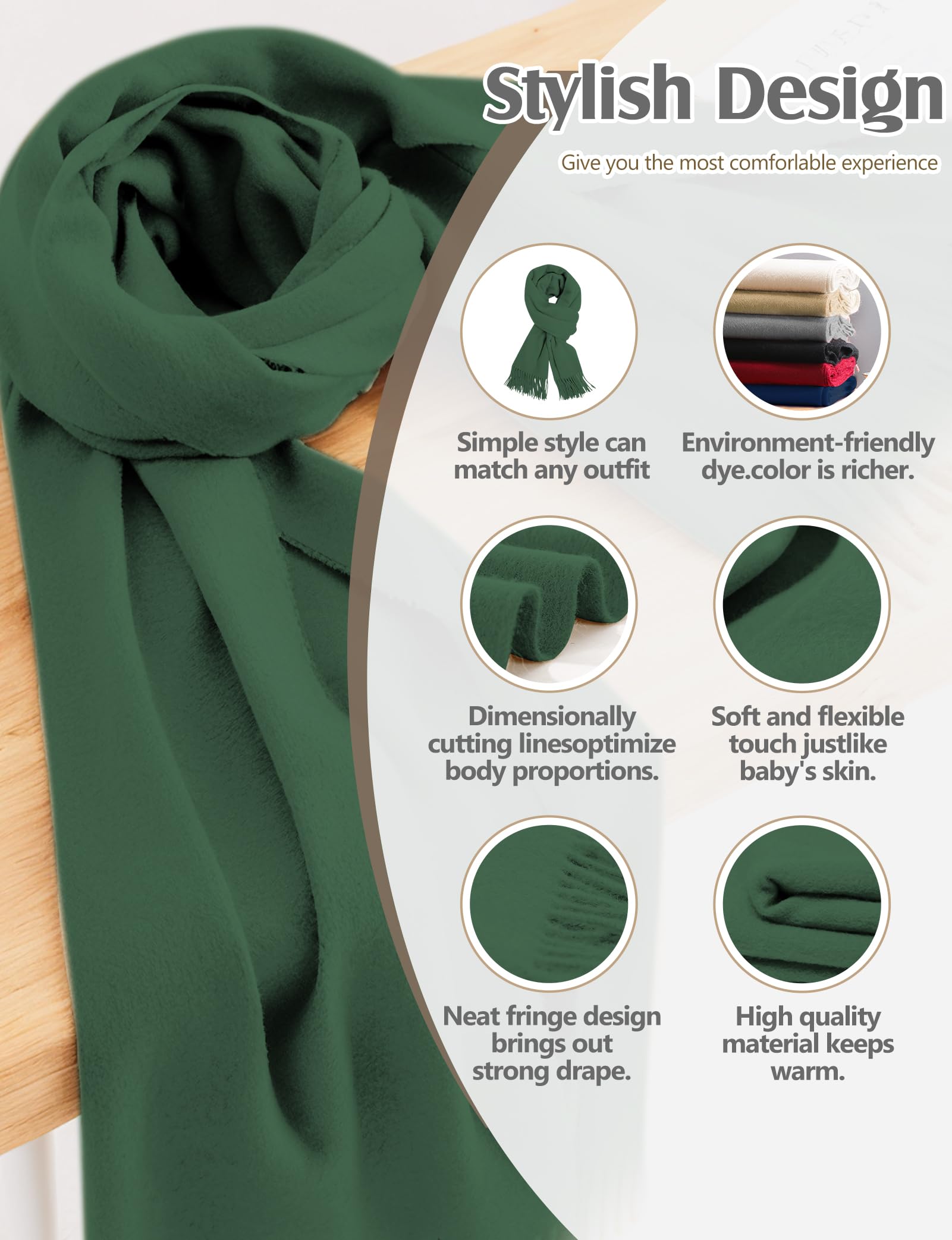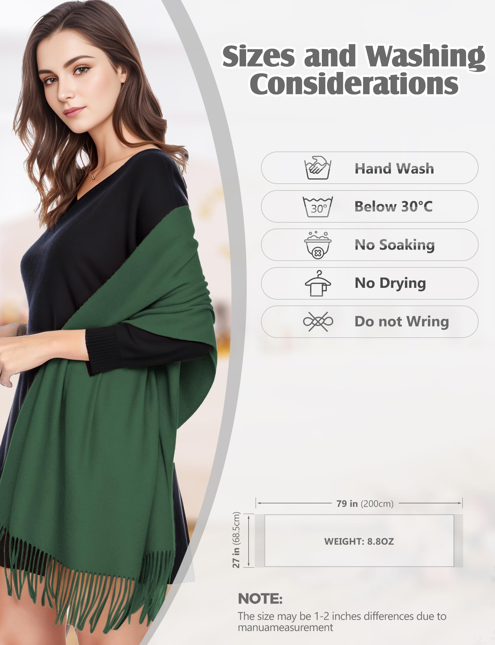 Standard Size & Medium Thickness: Approx 70×200cm (27×78in), ±3cm error for manual measurement. Medium weight, temperature-resistant 14°F-41°F, all-season use. Twice softer than cotton—warm, breathable, multi-use as scarf, head wrap, shawl, blanket, etc.