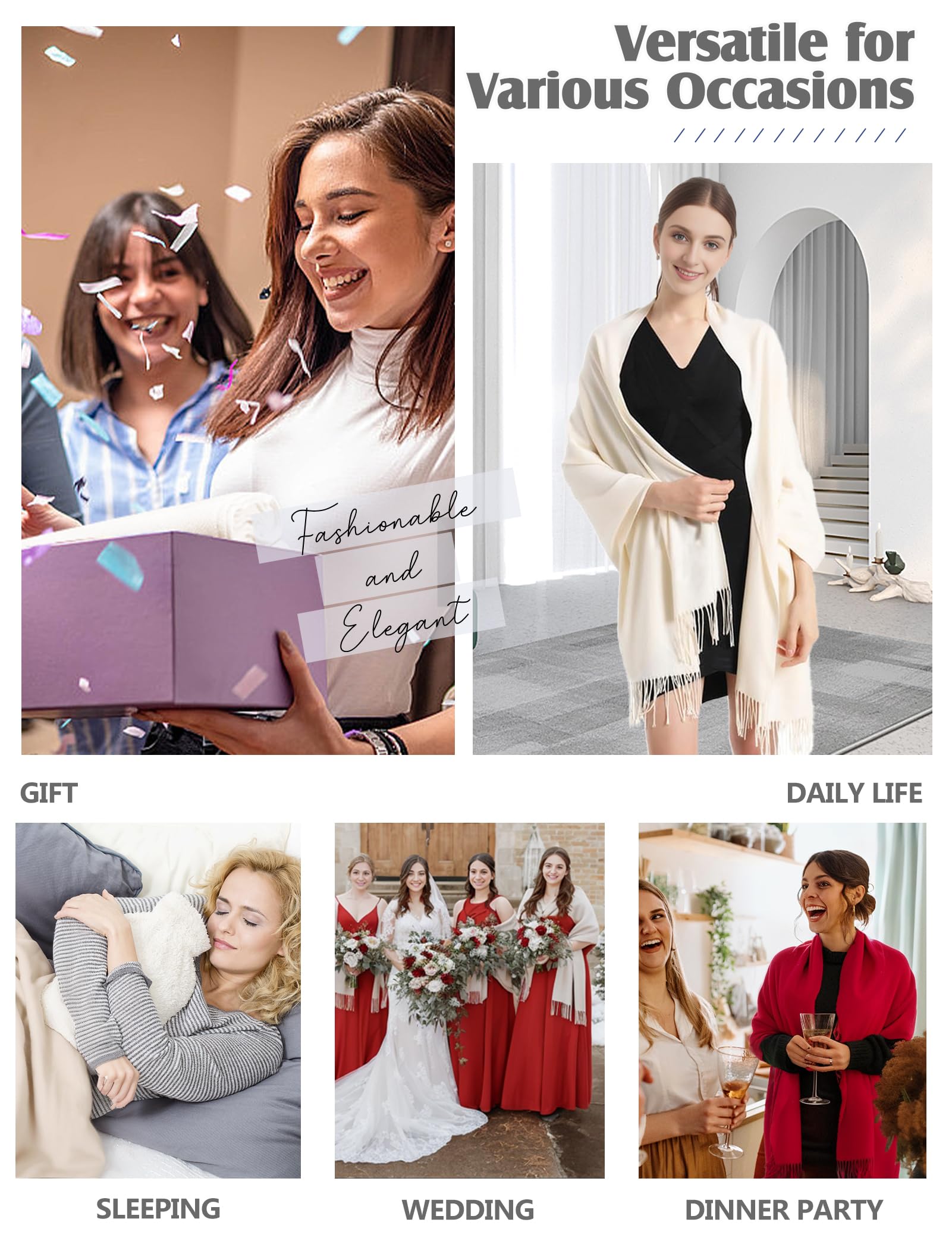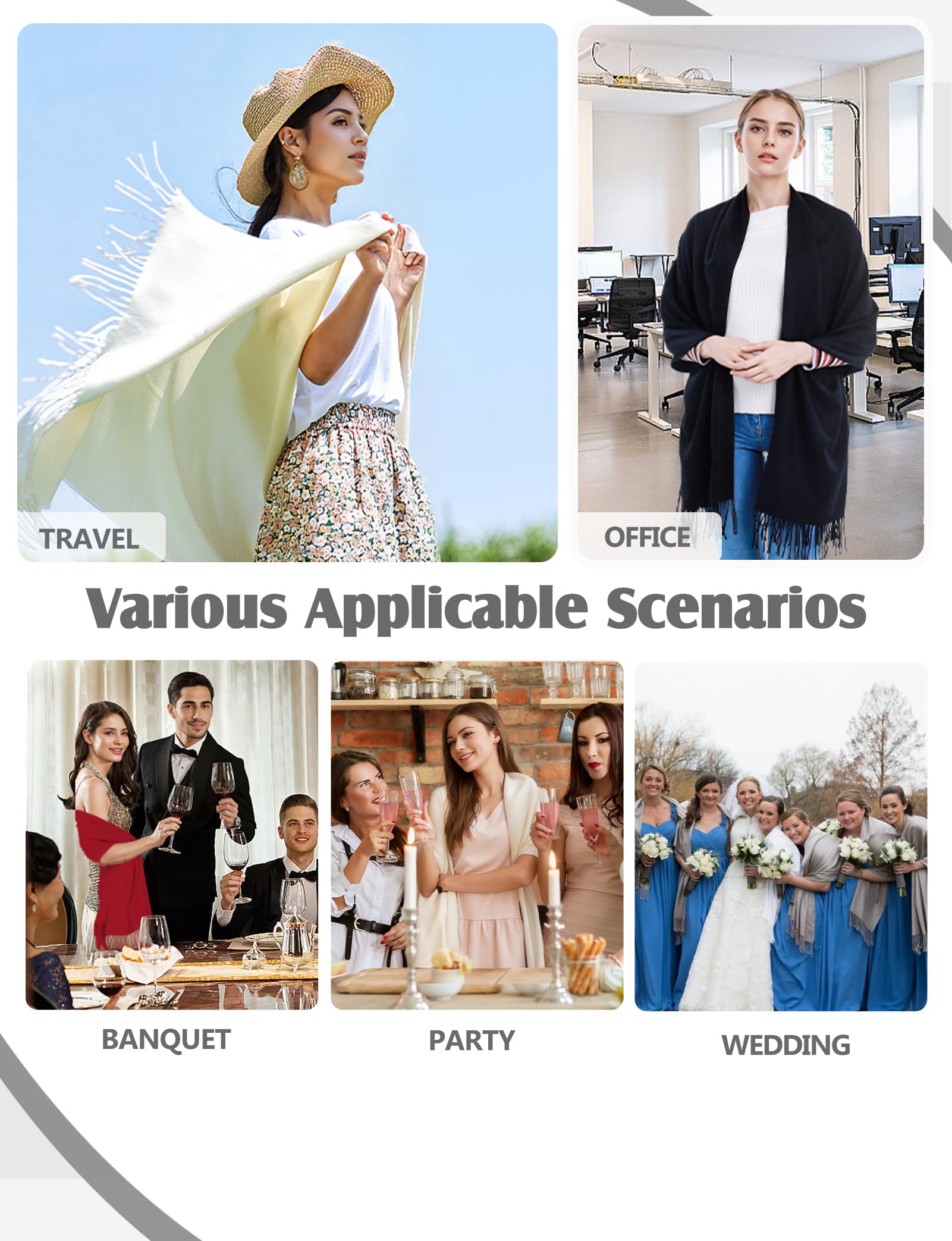 Versatile Scenarios: Multi-color options, perfect for weddings, parties, dinners & more. Pairs easily with coats, sweaters, dresses. Ideal for cold days, cool summer nights & air-conditioned spaces (office, plane, theater, etc.).
