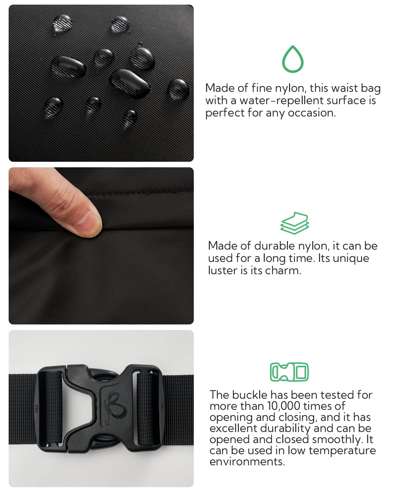 Premium Material & Sturdy SBS Zipper: Hiking waist bag is made of high-quality nylon material, durable and breathable, fine workmanship and tight stitching. Smooth zippers ensure users to quick access to the items, preventing items from falling