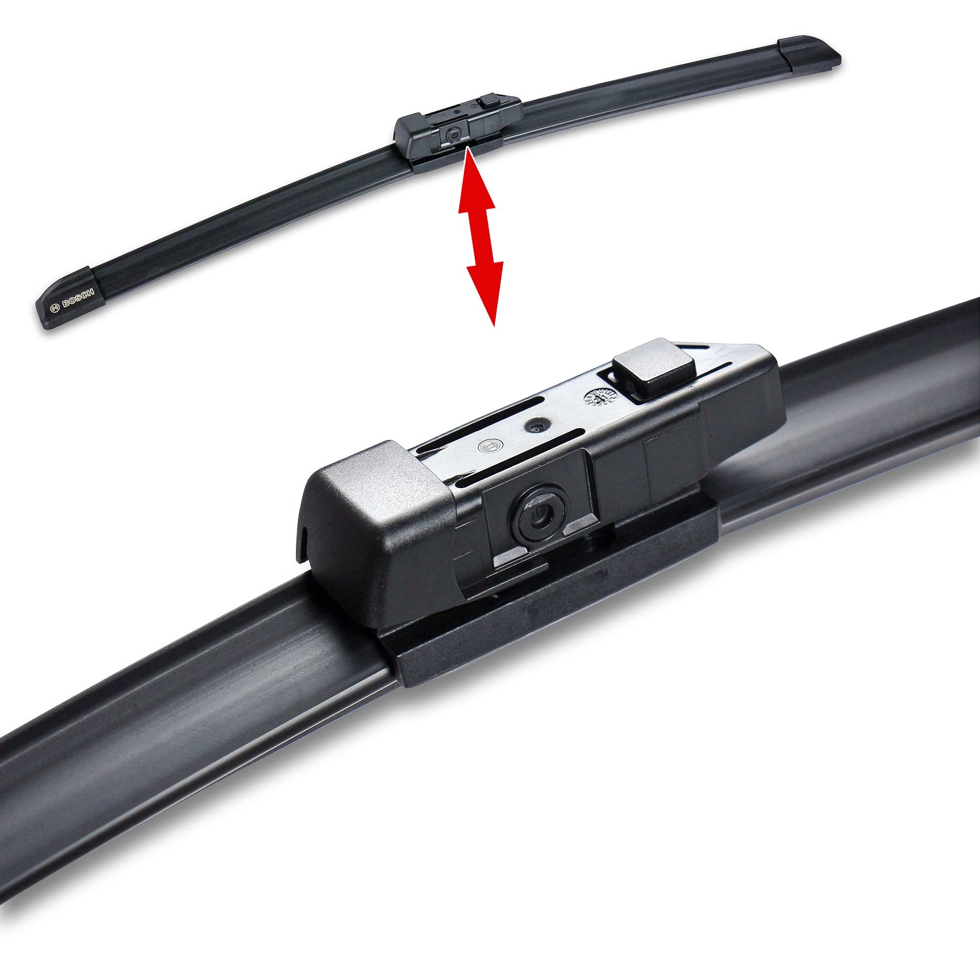 Bosch AeroTwin's patented beam design contains no metal or plastic brackets, joints or hinges, offering an ideal technology upgrade for vehicles originally fitted with conventional wiper blades. The specially blended dual rubber compound with graphite coating removes even the smallest traces of water for exceptional all-weather visibility and smooth, quiet operation. Specific beam curvature for OE specialty wiper arm types, coupled with dual precision-tensioned steel springs, ensures uniform pressure along the entire blade length for crystal clear visibility. Built-in asymmetrical wind spoiler uses air flow to increase blade-to-windshield contact - for consistent performance at highway speeds. Wind spoiler also serves to protect the tension springs from damage by severe weather elements for increased durability and long life. Pre-assembled OE style adapter provides OE fit and function for simple, easy installation on specific vehicles. Set of 2. Note: AeroTwin wiper blades are designed to fit vehicles with specific wiper arm connnection types - they are not universal fit wiper blades. Please verify specific vehicle fitment details with fit checker above.