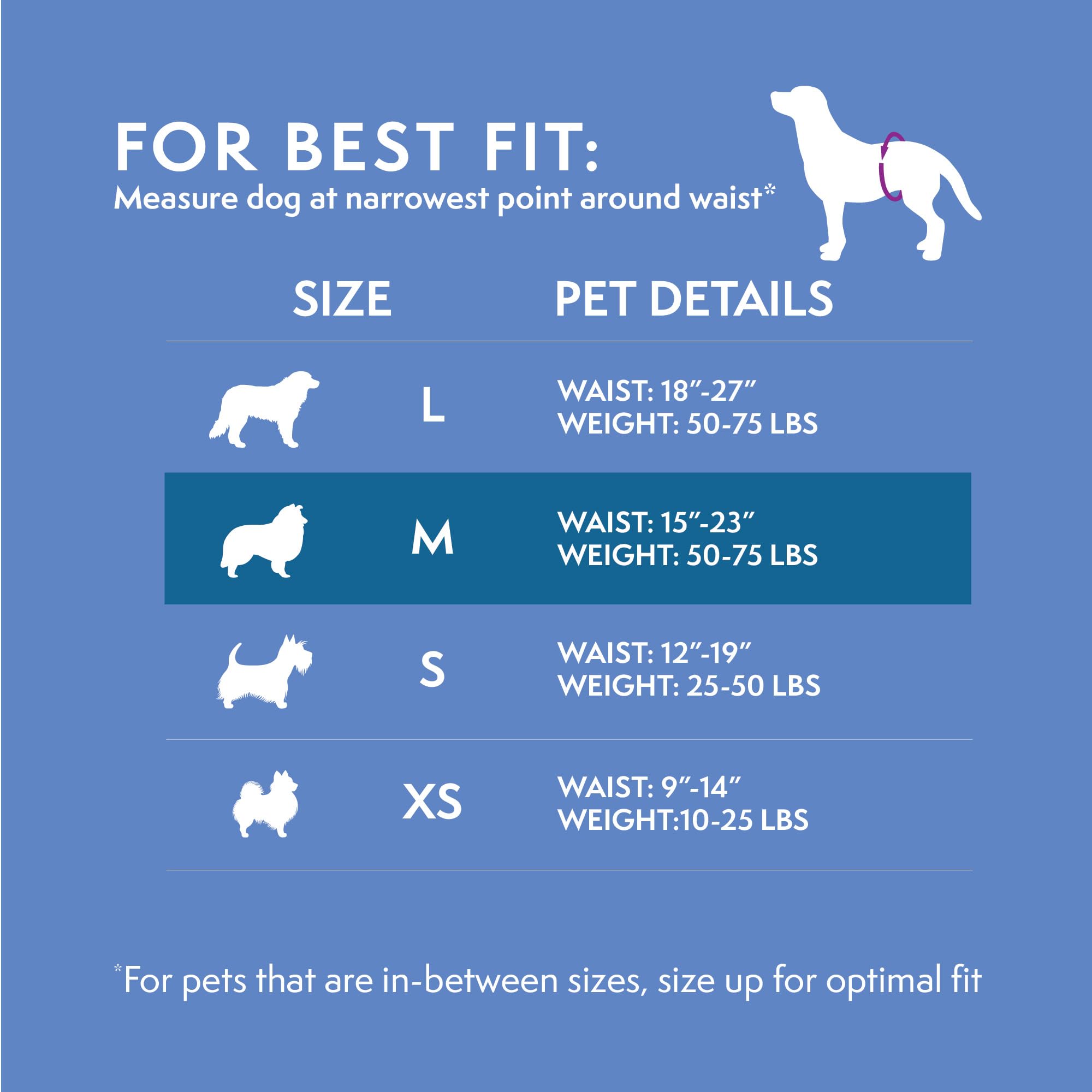 MEDIUM MALE DOG WRAPS: Perfect for medium-sized male dogs weighing 25-50 lbs with a 15”-23” waist, these disposable belly bands provide a secure, adjustable fit; The leak-proof design offers reliable comfort and protection, even for active, wiggly pups