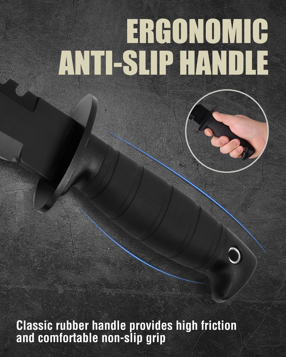 Rubber Handle & Nylon Sheath: Classic rubber handle of survival knife, provides high friction and comfortable non-slip grip for use. Heavy duty nylon sheath with easy open fastening system and belt hanging system for easy and safe carry