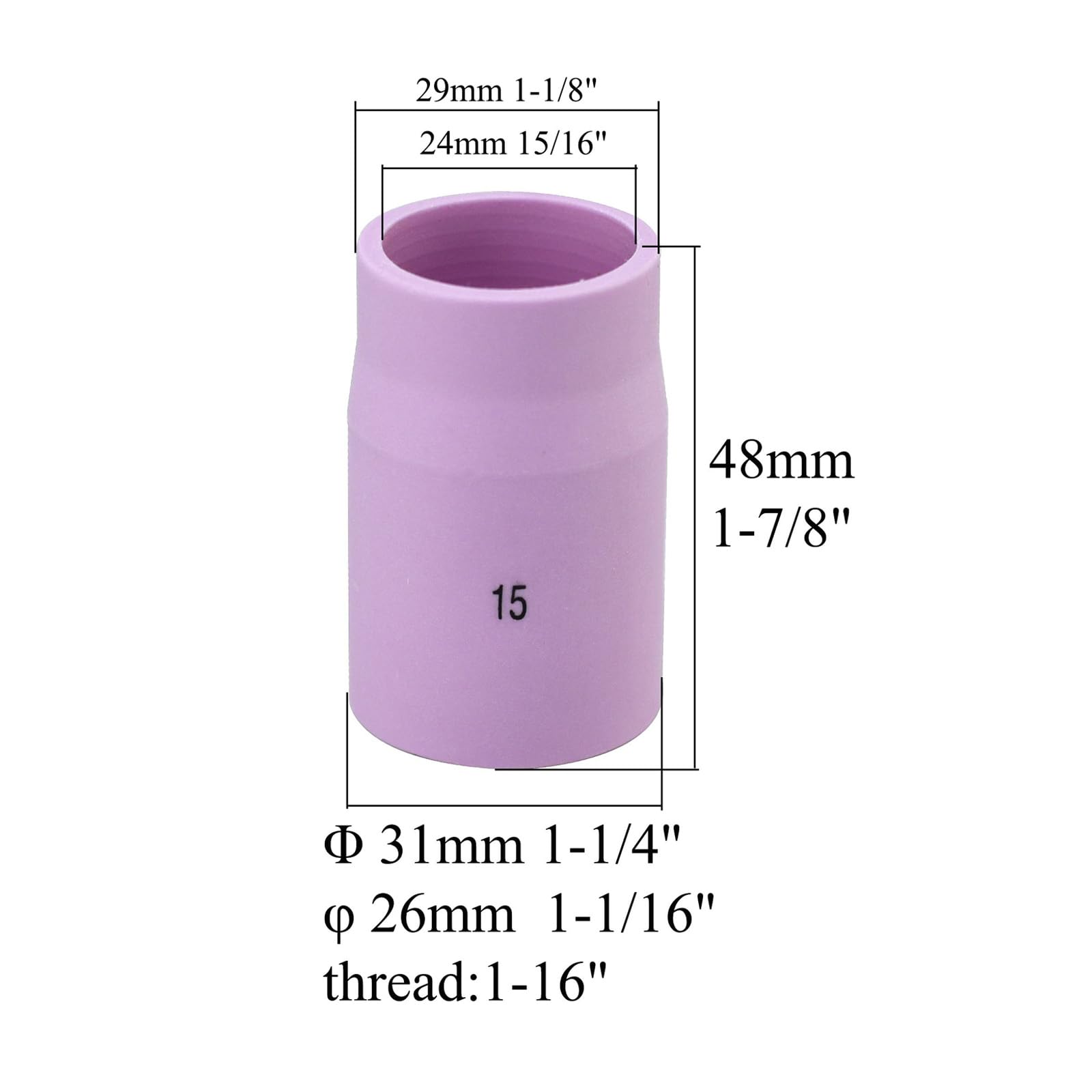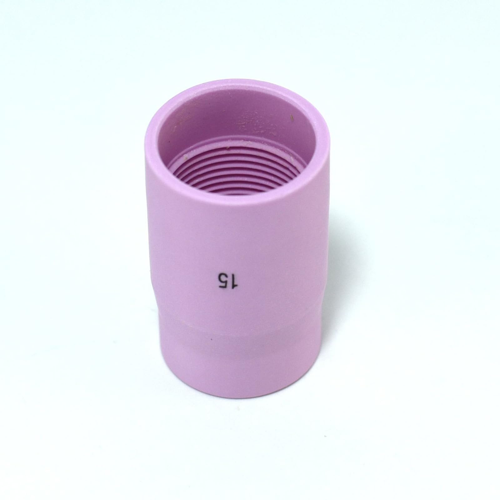 Large gas lens Alumina ceramic cups 53N89 #15 for large gas lens fit TIG welding torch 9 17 18 20 26 Ref No : 53N89 #15 15/16" Orifice Size : (15/16" x 1-5/16 ) D24 x 48mm Quantity: 10pcs These Alumina Large Gas Lens fit all 9 17 & 26 series air cooled torches and 18 20 series water cooled torches, including the Lincoln PTA-17, PTA-18 and PTA-26 torches, Miller Diamondback DB17, DB18 and DB 26 torches, along with the Weld craft WP-17, WP-18 and WP-26 torches.