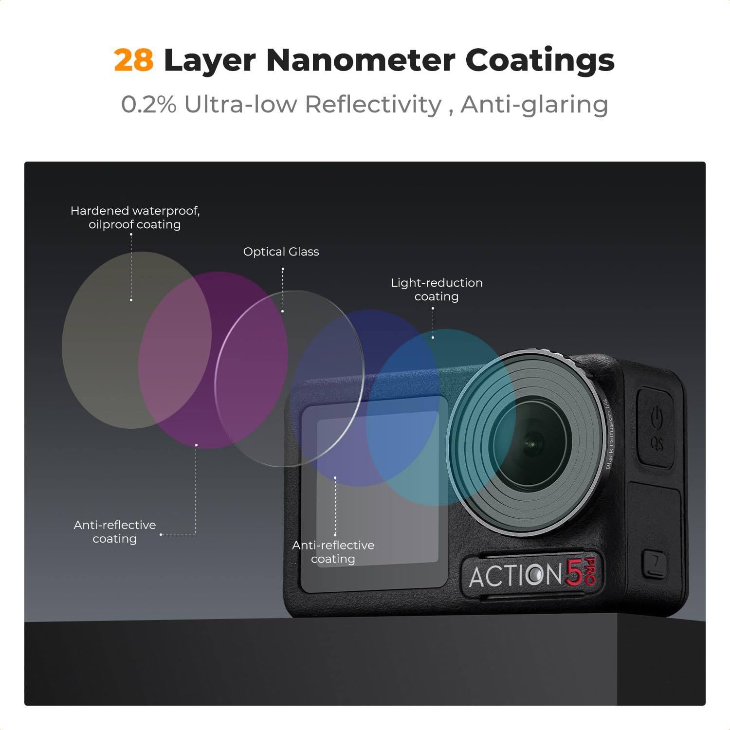 28 Multi-Layer Coatings: Multi-coated filter utmost reduce the glaring and flares, waterproof, scratch-resistant, dustproof, and oil-proof, protecting your action camera lens from all-rounds