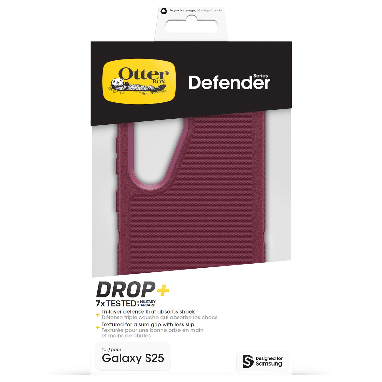 Legendary durable Samsung Galaxy S25 case, Defender Series, with a multi-layer construction guards your device from serious drops, dirt, scrapes and bumps. Wireless ready, it works with Qi charging. Plus, the included holster does double duty as a belt clip or hands-free kickstand. Specifications: Compatible With: Samsung Galaxy S25 . Drop Height: DROP+ | 5X as many drops as military standard (MIL-STD-810G 516.6) . Dimensions: 6.24 x 3.26 x 0.52 in | 15.85 x 8.27 x 1.33 cm . Weight: 0.13 lbs | 57.44 g . Materials: Polycarbonate shell . Synthetic rubber slipcover . Polycarbonate holster . Case Features: Multi-layer defense features a rubber outer cover for better grip and impact absorption while the rigid inner shell offers extra protection . Durable rubber outer cover provides drop-resistant grip . Port covers block dust and dirt . Bumpers around the camera protect against hard hits . Screen lip keeps display hovering safely off surfaces . Holster clips to bags and packs / Kickstand for hands-free viewing . Wireless charging compatible . Works with OtterBox screen protectors . Fully compatible with 5G networks . Limited lifetime warranty supported by hassle-free customer service .