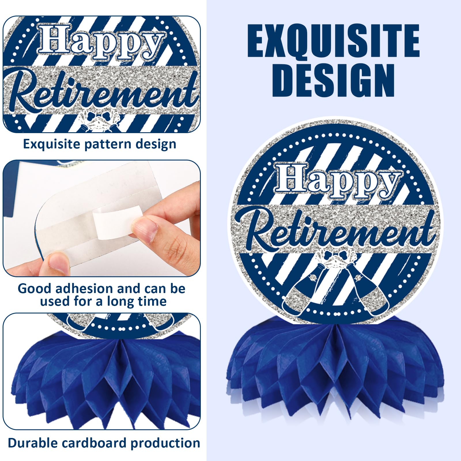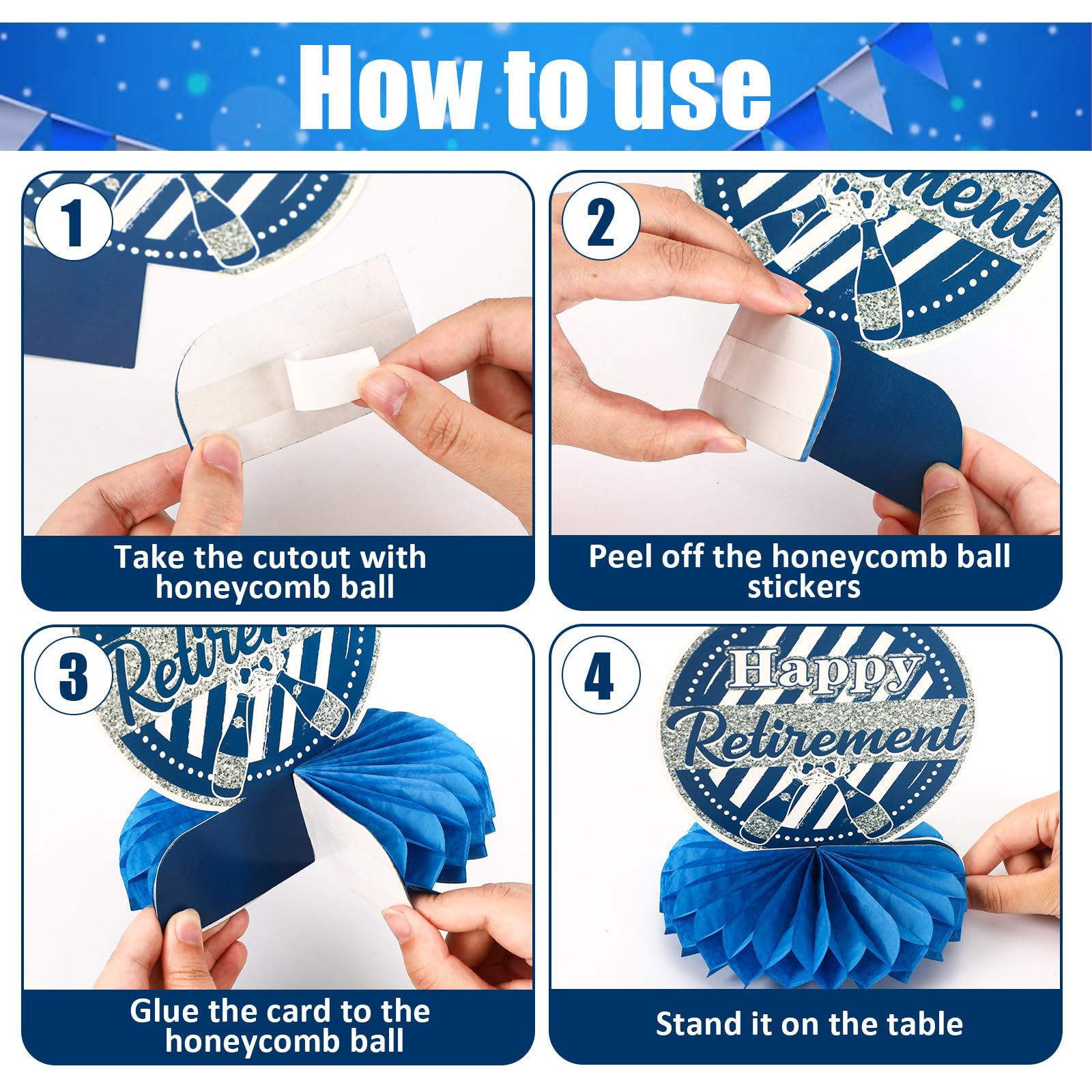Easy to Use: Retirement party decorations are simple and easy to use. first, tear off the sticker of the honeycomb ball, then paste the honeycomb ball into the fixed area on the card, and then unfold and paste the honeycomb ball to complete the assembly, making the preparation process easy and enjoyable