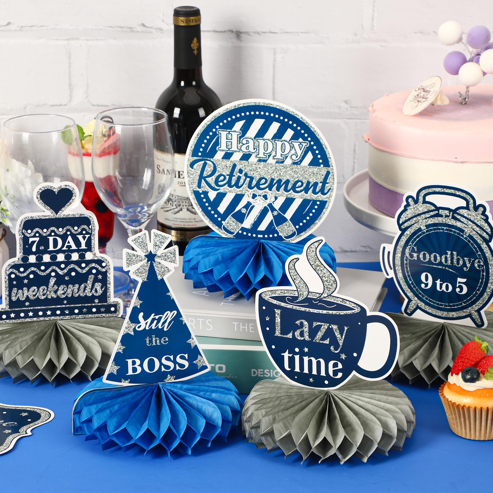 Retirement Party Decoration: 10 pieces blue and silver retirement table decorations with different designs, each happy retirement decorations has unique design, in the theme of retirement, and have a variety of elements to make the retirement party decorations more vivid and interesting, adding unique charm to the celebration