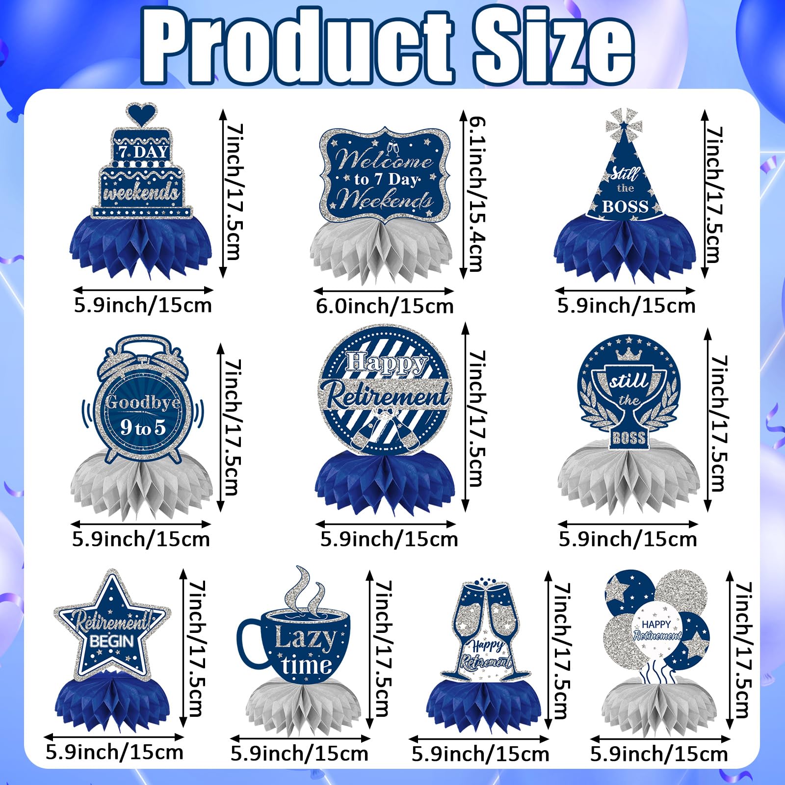 Diversified Design: The 10 pieces retirement honeycomb centerpieces have different designs. You can freely match and combine the retirement centerpieces for tables according to your needs to create colorful decorative effects, show your personalized style and make your party and decoration more interesting