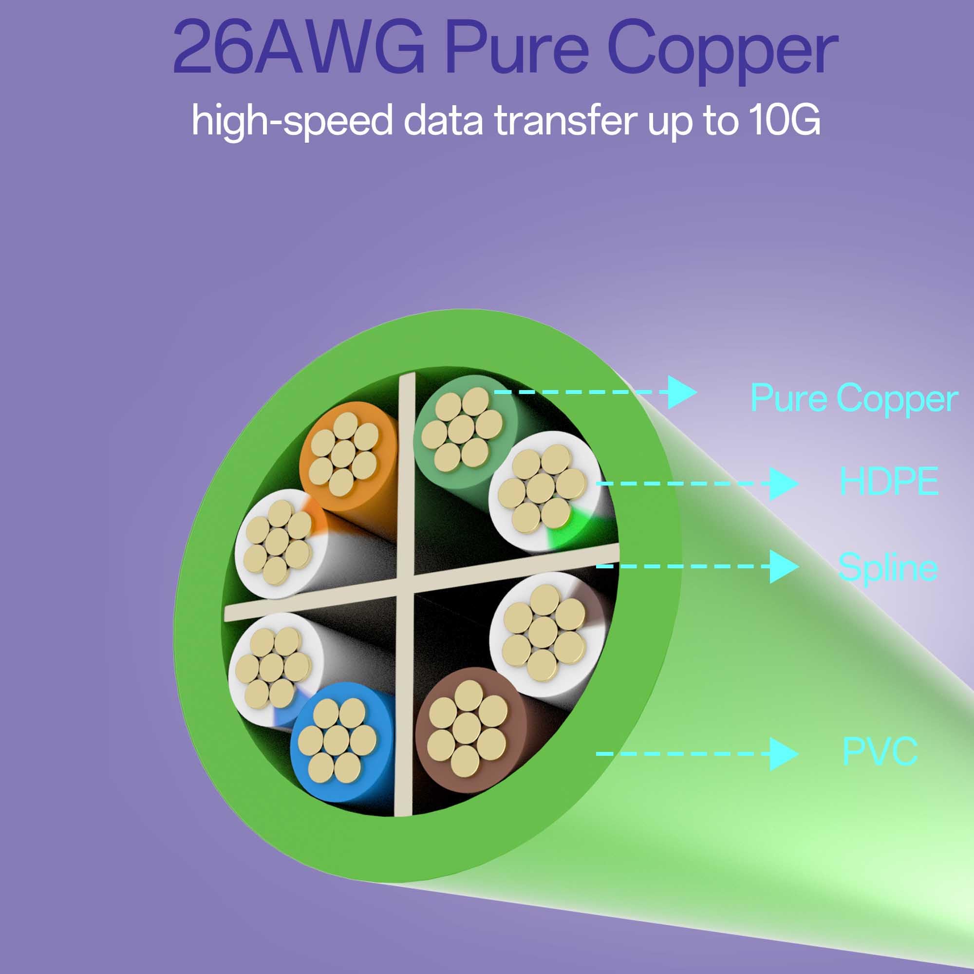 High Performance : Cat 6 ethernet cable support up to 10 Gbps and 550 Mhz application. Cat6 patch cable are made of 26AWG pure copper with reliable performance. Ethernet cables compliant with ANSI TIA 568.2 D standard.