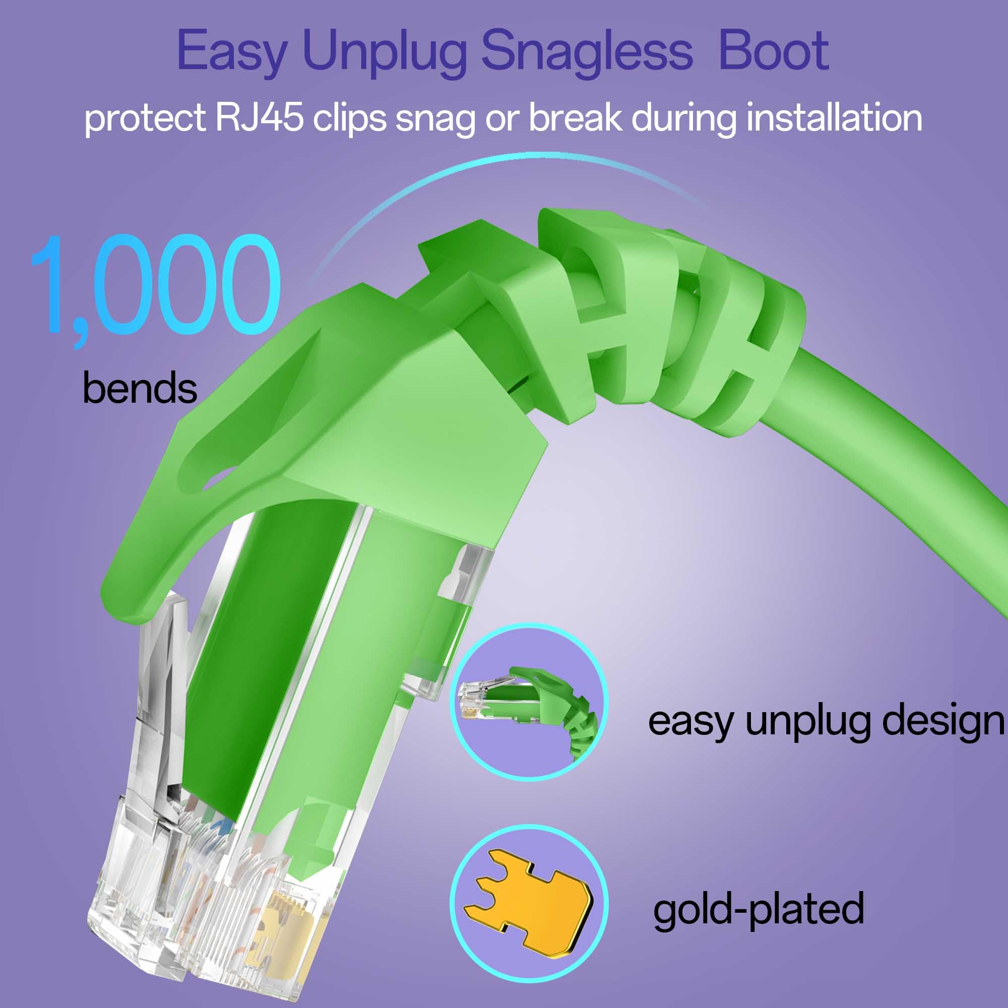 Easy Unplug Design: Cat6 ethernet cord with snagless plug protects plugs when routing through cable managers or pathways. Cat 6 patch cable are easy plug and unplug from ports.