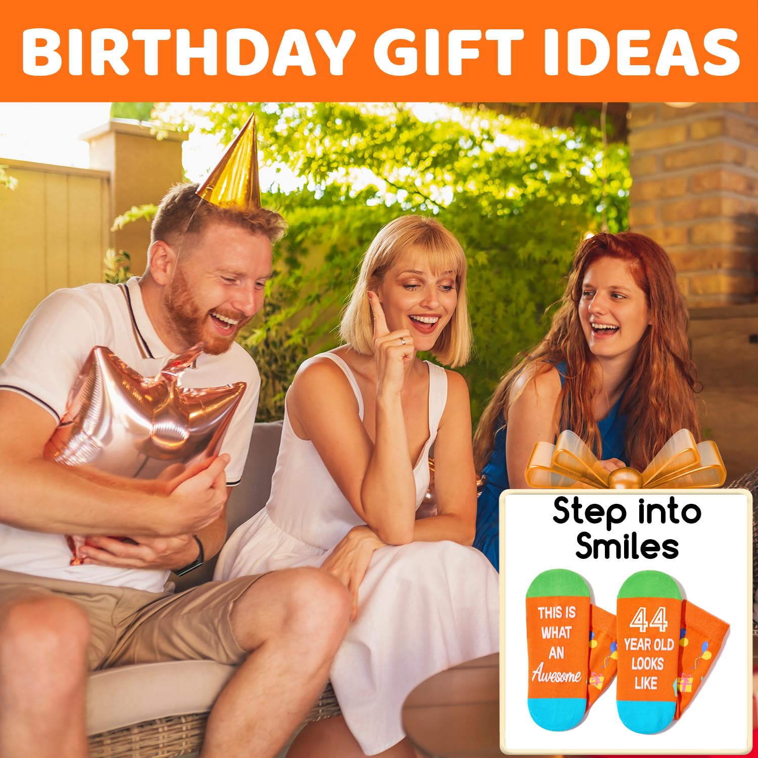 GIFTS FOR 44 YEAR OLDS: The top of the socks features birthday gifts, hats, cakes, and other elements, the bottom features a hilarious secret message written in non-slip ink: "THIS IS WHAT AN Awesome 44 YEAR OLD LOOKS LIKE."