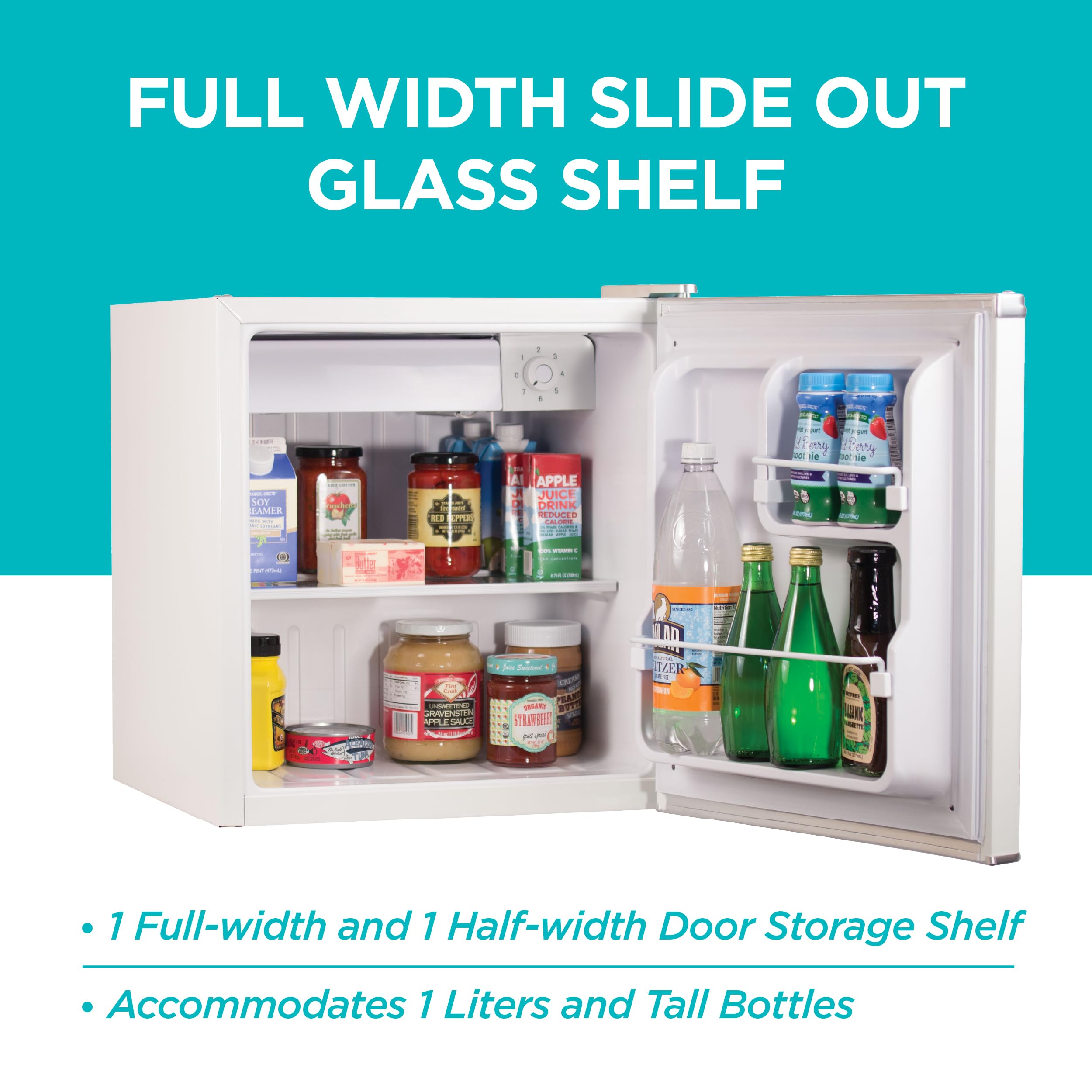 Spacious Capacity: A removable glass refrigerator shelf helps expand storage space while a full and half-width door storage bin accommodates cans and small containers or 1-liter or taller bottles