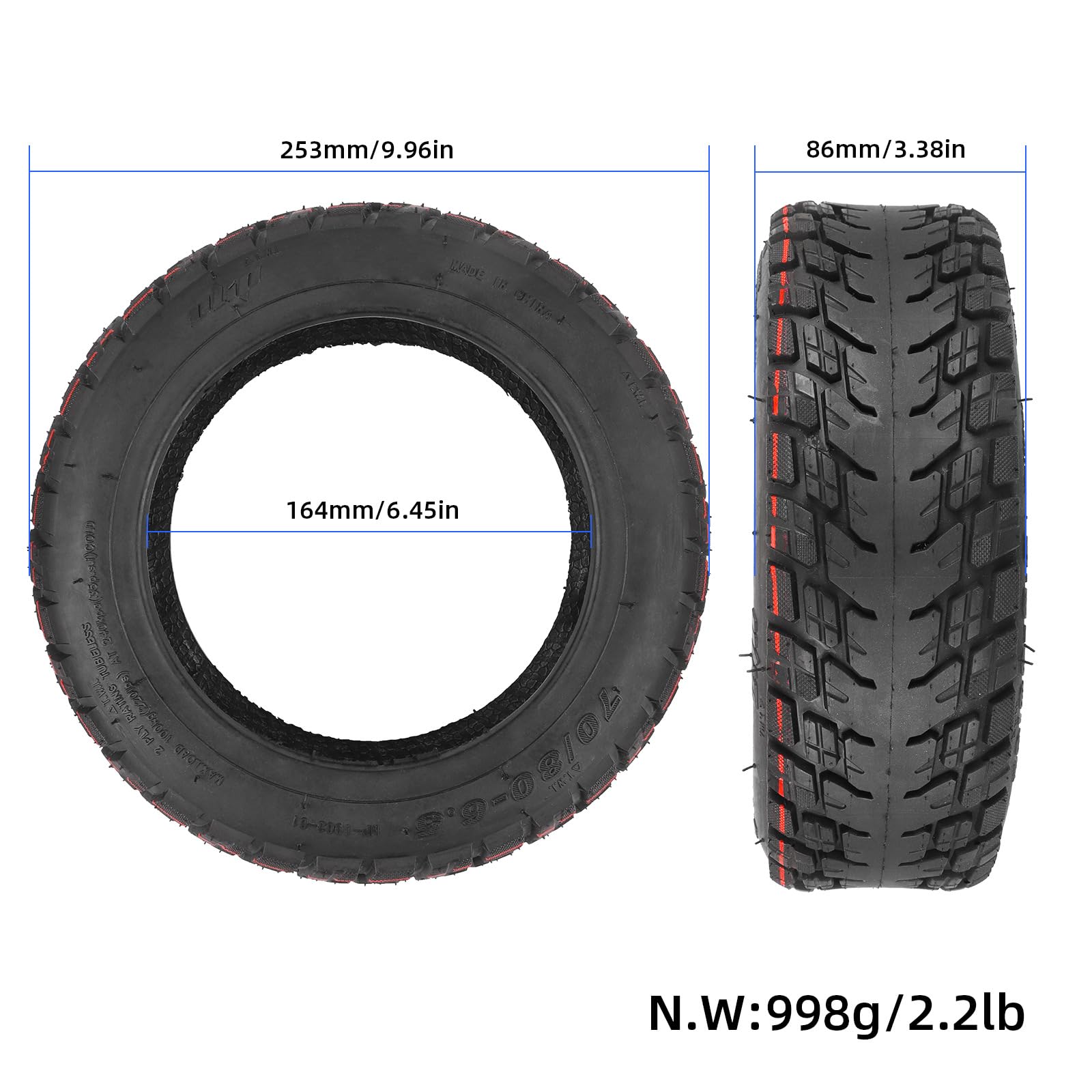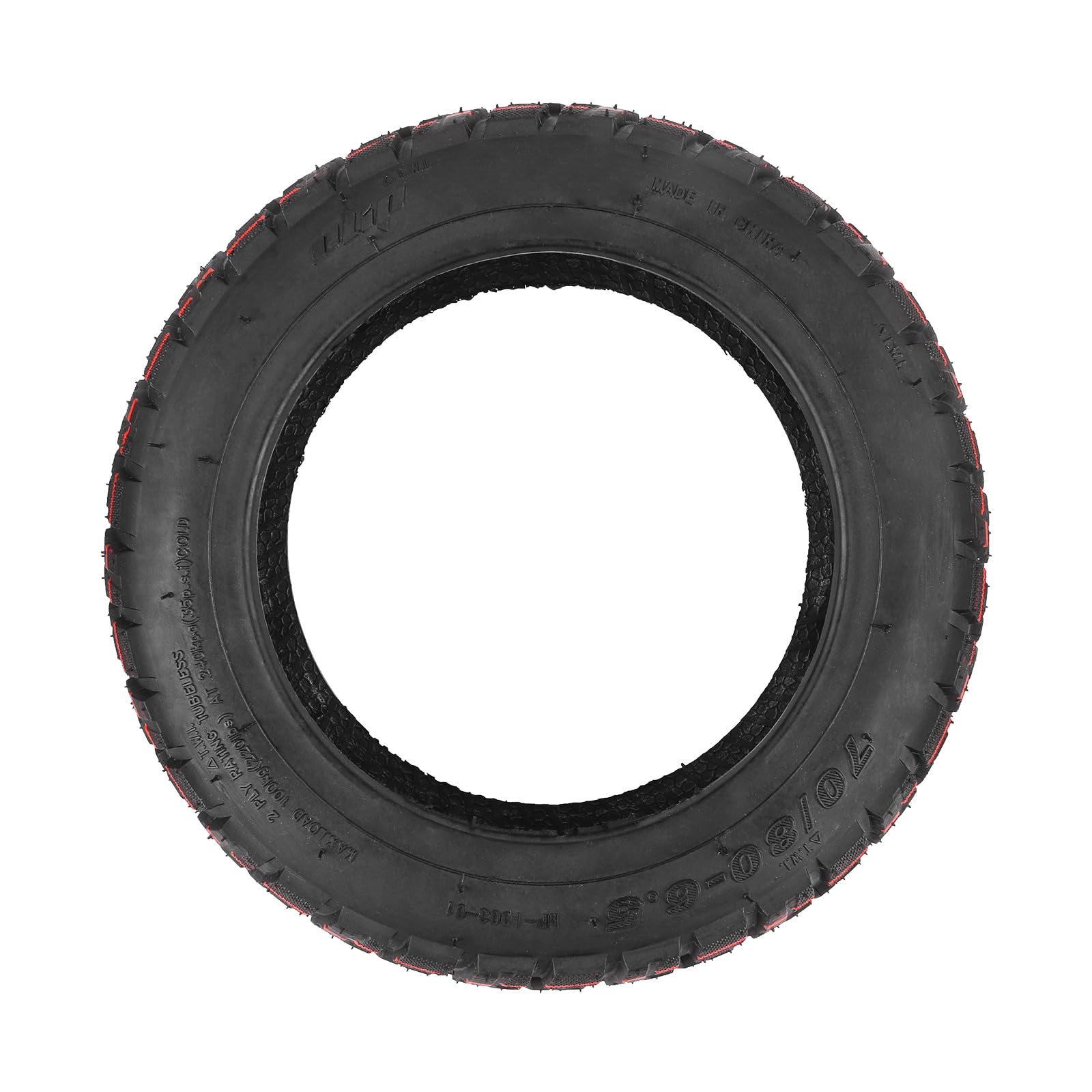 Specifications: Material: rubber Tubeless Tire Size: Inner diameter: 6.45"/164mm, outer diameter: 9.96"/253mm, tire width: 3.38" / 86mm Package include: 1 * 70/80-6.5 11″ Tubeless Tire