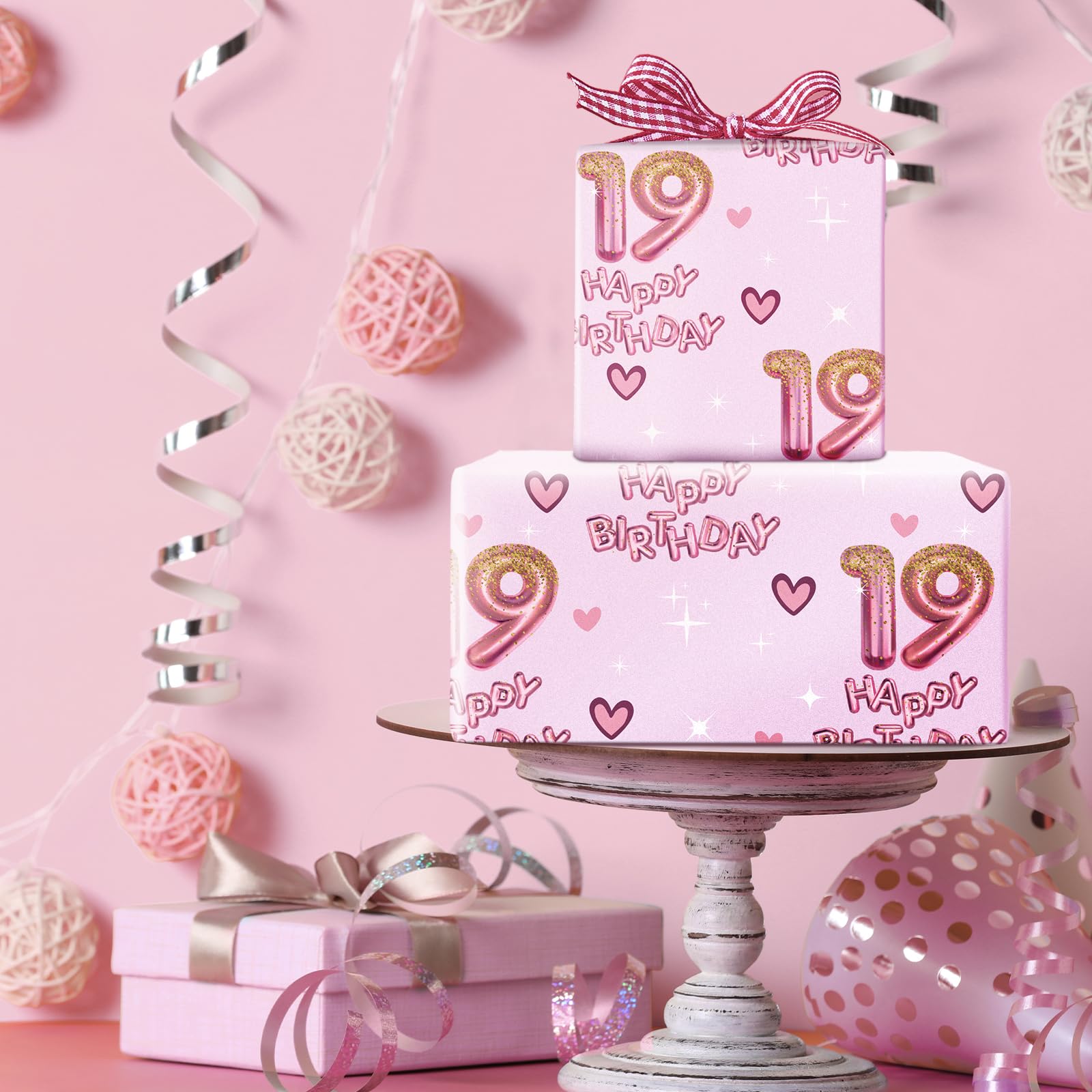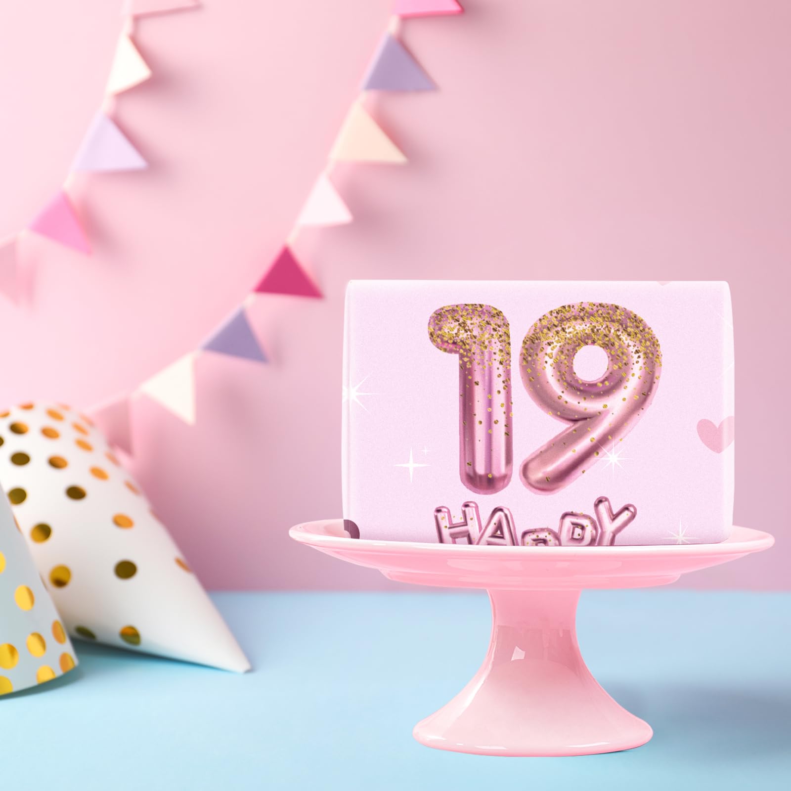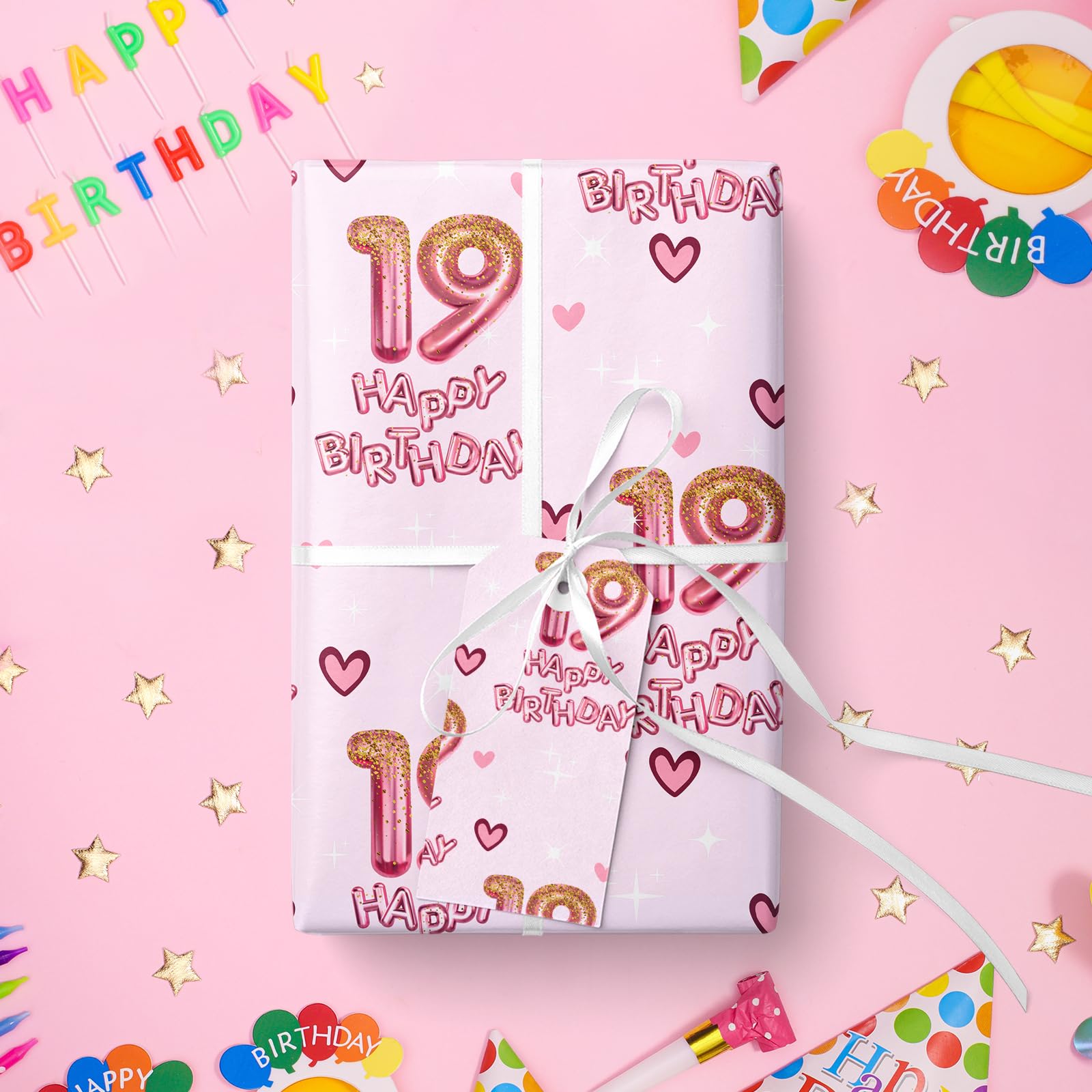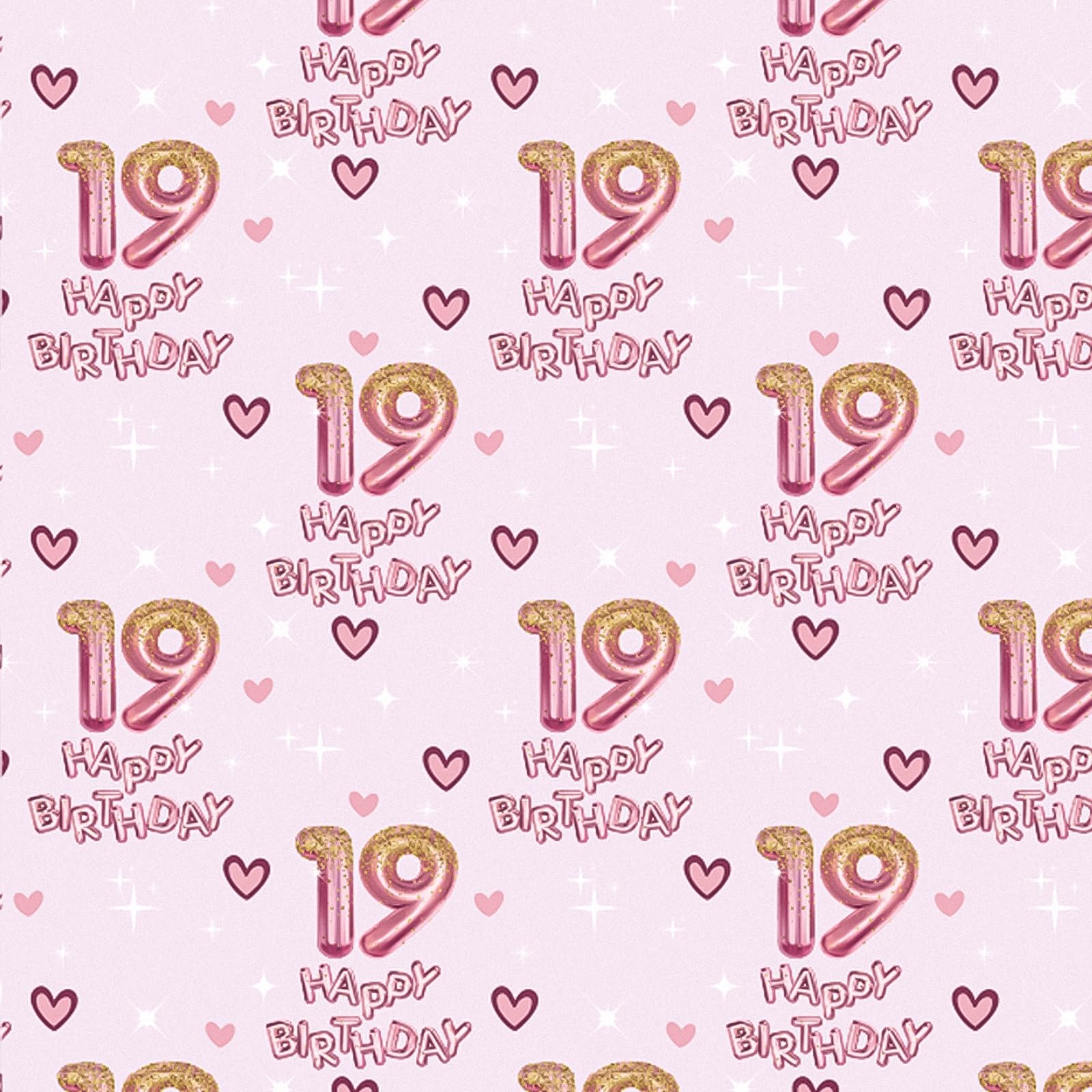 Vibrant Design: Wrapping paper printed pink number 19 balloons, hearts and "HAPPY BIRTHDAY" text on pink background that adds excitement to any gift, making it perfect for girls' birthday parties
