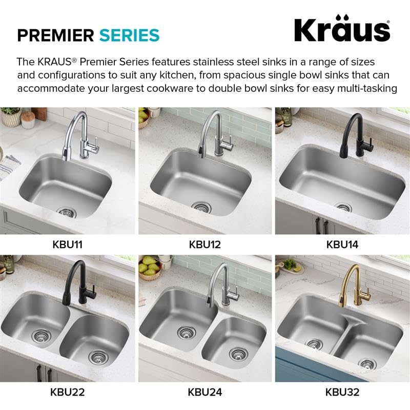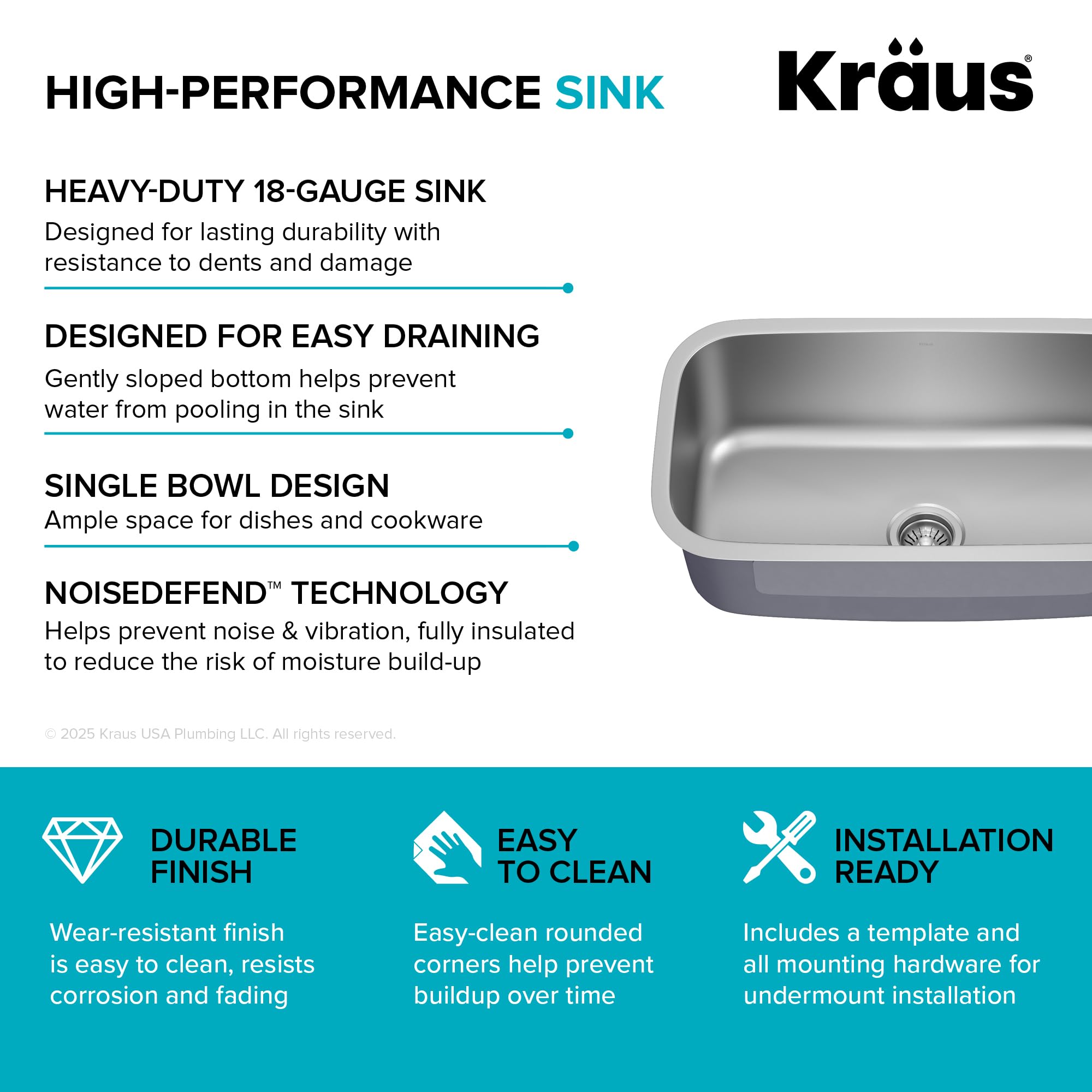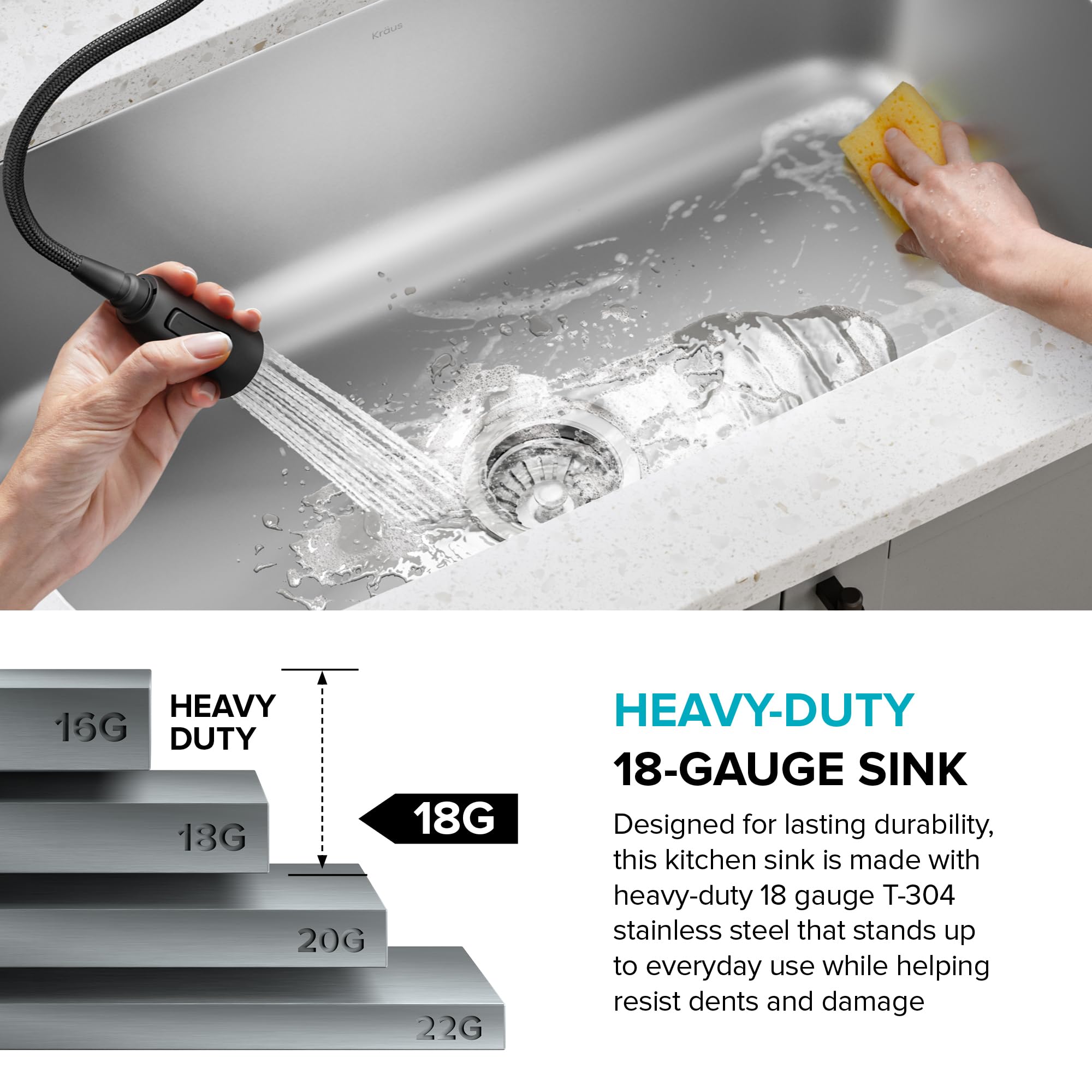 Product Description Kraus kitchen sinks are known for excellent quality and sturdy construction. Made with durable T-304 stainless steel, this undermount sink will stand up to constant use and easily handles your toughest kitchen tasks. Commercial grade satin finish makes cleanup as easy as wiping the surface with a damp cloth. Since thicker steel means a stronger, more dent-resistant sink, this model is made from 18 gauge stainless steel, always 1.5mm thick. NoiseDefend soundproofing technology ensures a quiet kitchen experience by eliminating noise and vibration when the sink is in use. All Kraus stainless steel sinks come with free kitchen accessories for added convenience.