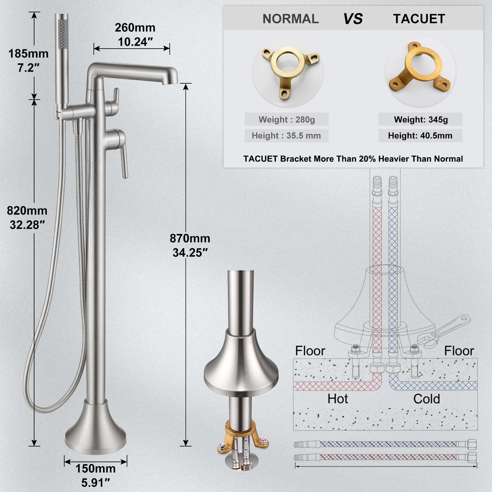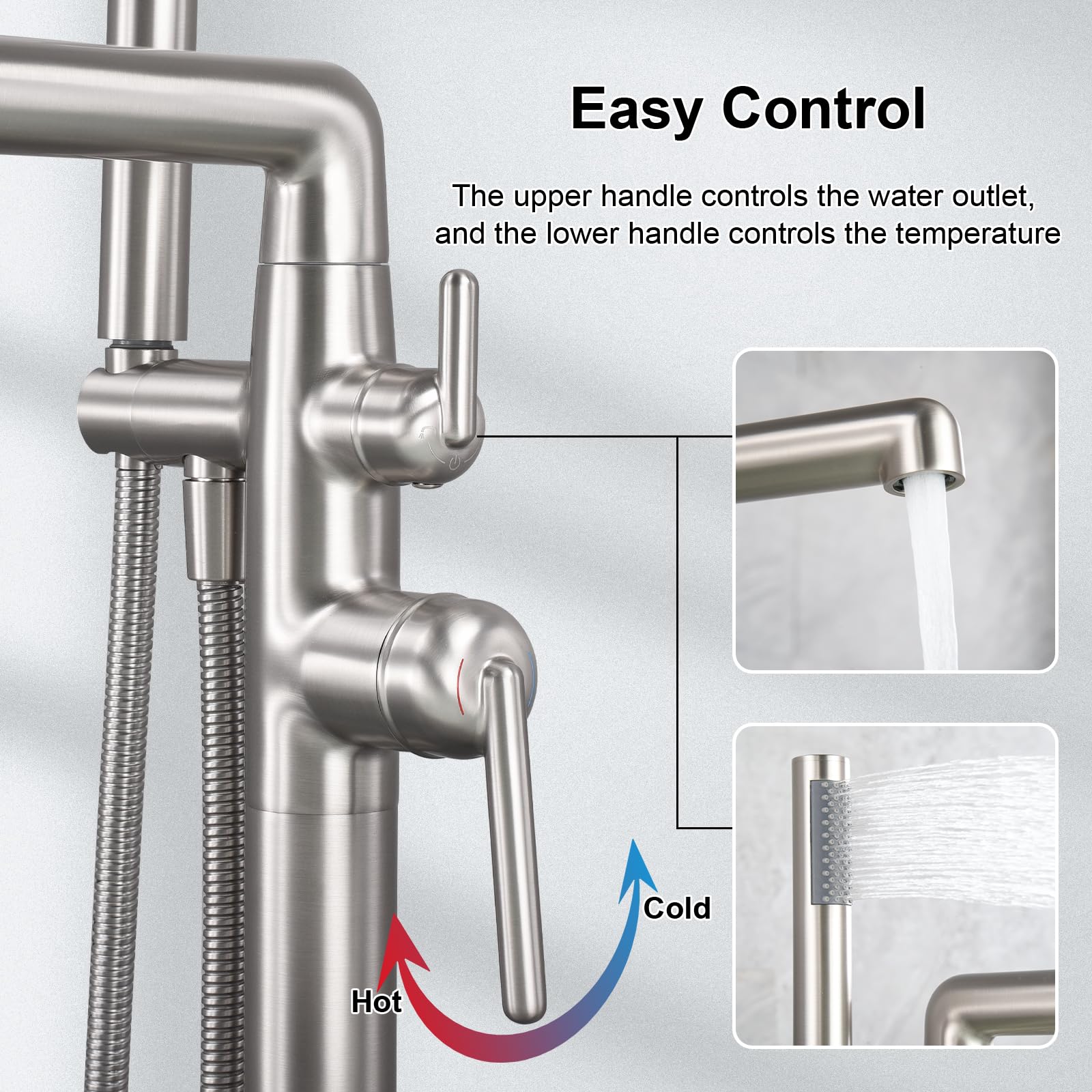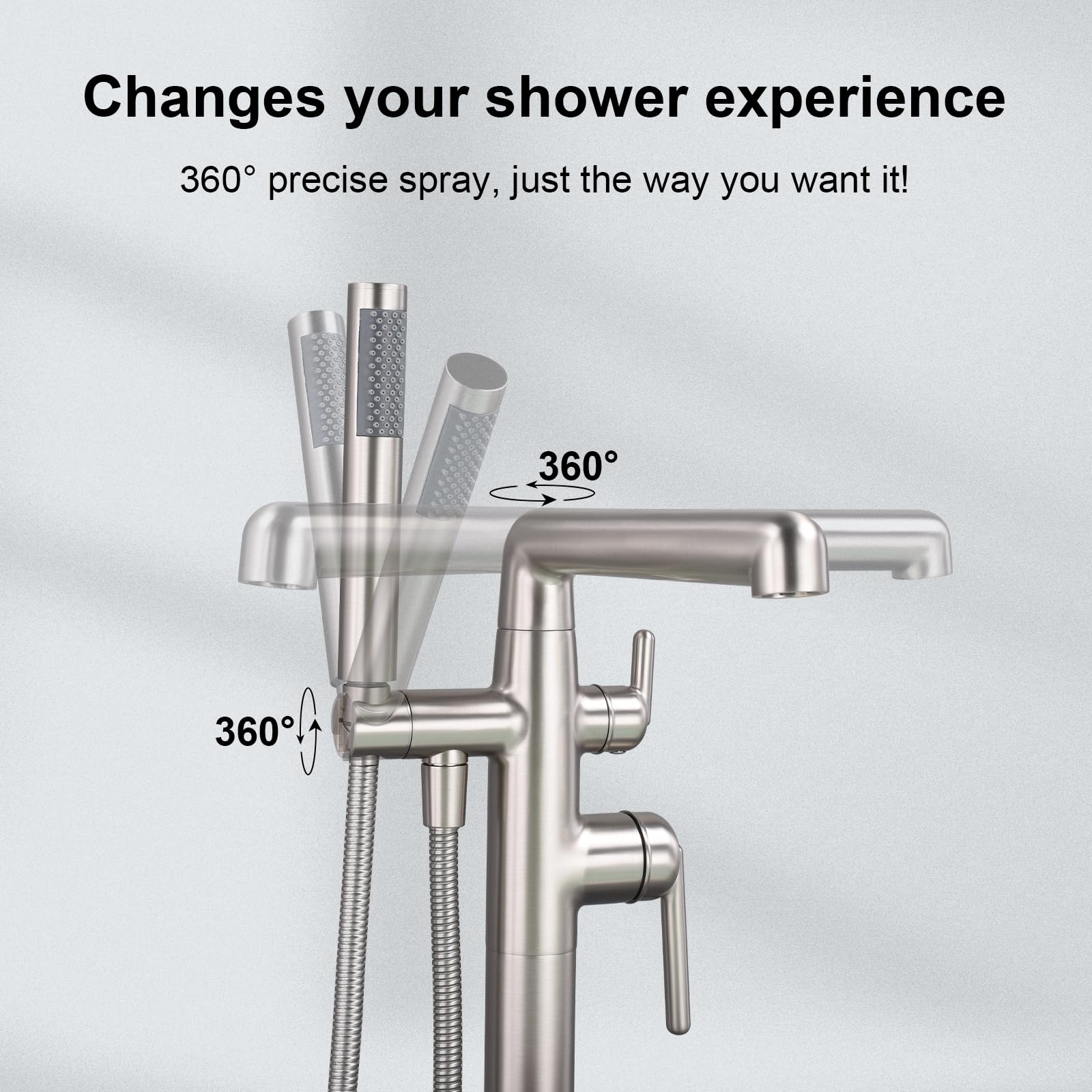 【RELIABLE DESIGN】Freestanding tub filler comes with 10.24” extra long spout reach and 61.02” over height. It has 360° swivel spout, handheld shower with 59"(150cm) shower hose will help to rinse down the tub or rinse off after a bath,very convenient to clean.Come with a diverter knob, switch between tub spout and hand shower.